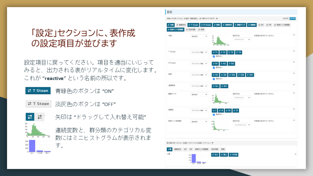 「設定」セクションに、表作成の設定項目が並びます 設定項目に戻ってください。項目を適当にいじってみると、出力される表がリアルタイムに変化します。これが “reactive” という名前の所以です。