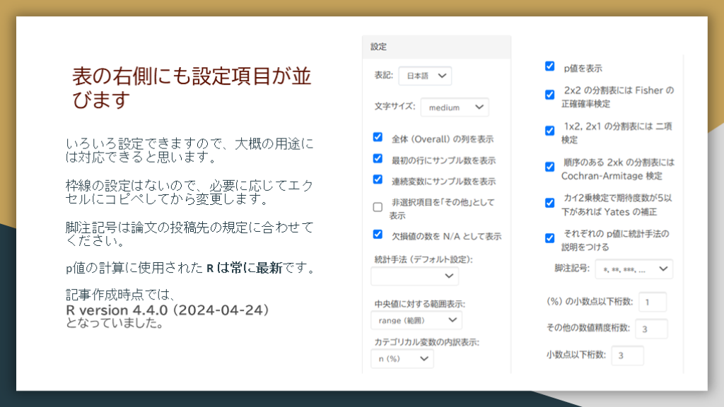 記事作成時点では、R version 4.4.0 (2024-04-24)となっていました。 出力された表の利用方法 #10.