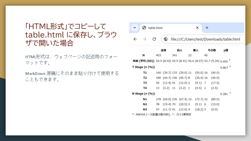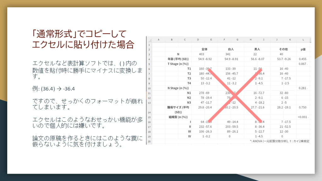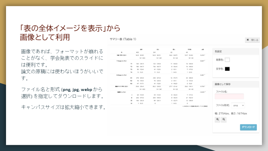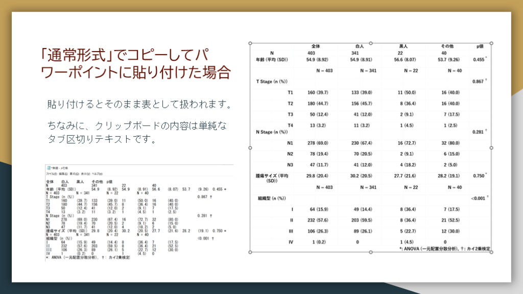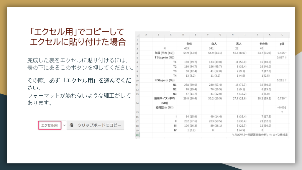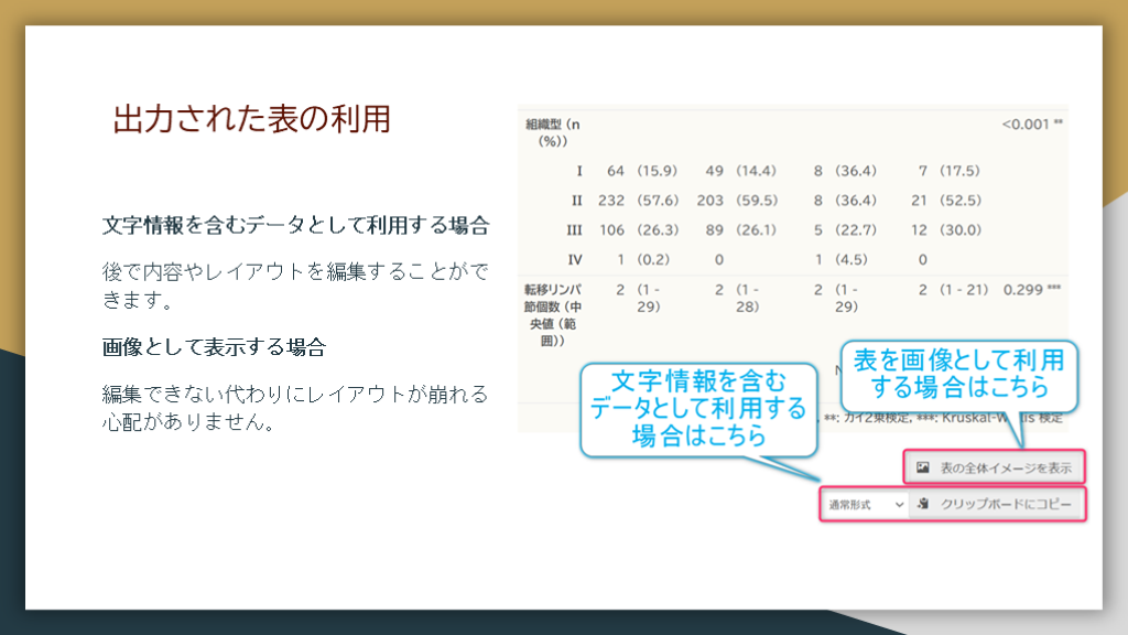 「表の全体イメージを表示」から画像として利用 画像であれば、フォーマットが崩れることがなく、学会発表でのスライドには便利です。論文の原稿には使わないほうがいいです。