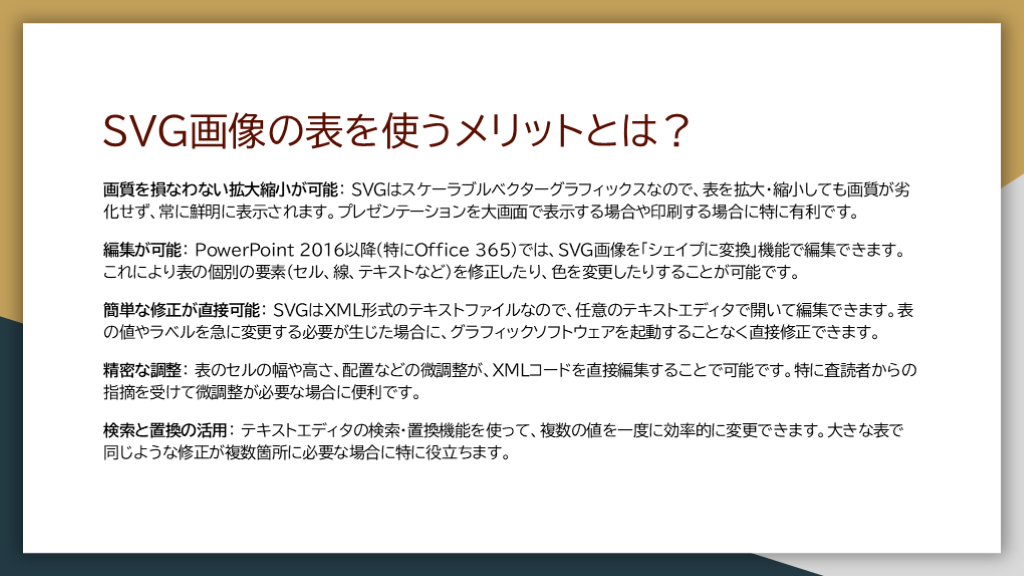 編集が可能: PowerPoint 2016以降(特にOffice 365)では、SVG画像を「シェイプに変換」機能で編集できます。これにより表の個別の要素(セル、線、テキストなど)を修正したり、色を変更したりすることが可能です。