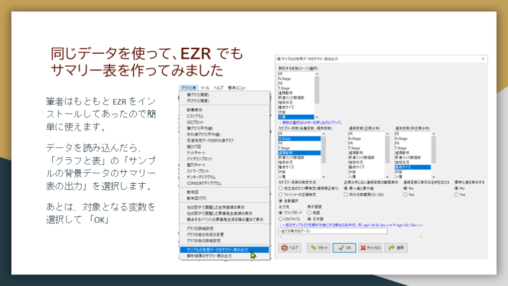 同じデータを使って、EZR でもサマリー表を作ってみました 筆者はもともと EZR をインストールしてあったので簡単に使えます。