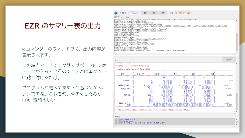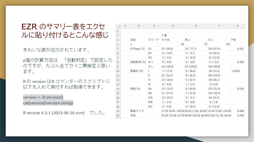 EZR のサマリー表をエクセルに貼り付けるとこんな感じ きれいな表が出力されています。