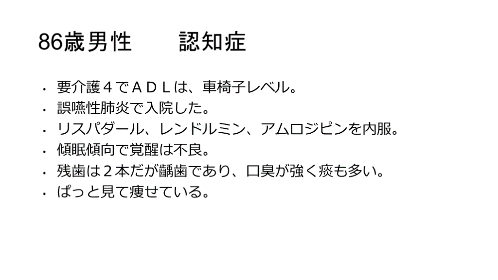 誤嚥性肺炎のマネジメント内科医としての腕が試されていると言っても過言ではありません。今回ABCDEアプローチでリスク評価、急性期疾患の治療、食事形態と栄養、薬剤のチェック、リハビリと総合的アプローチを行いマネジメントしていくことを学びます。