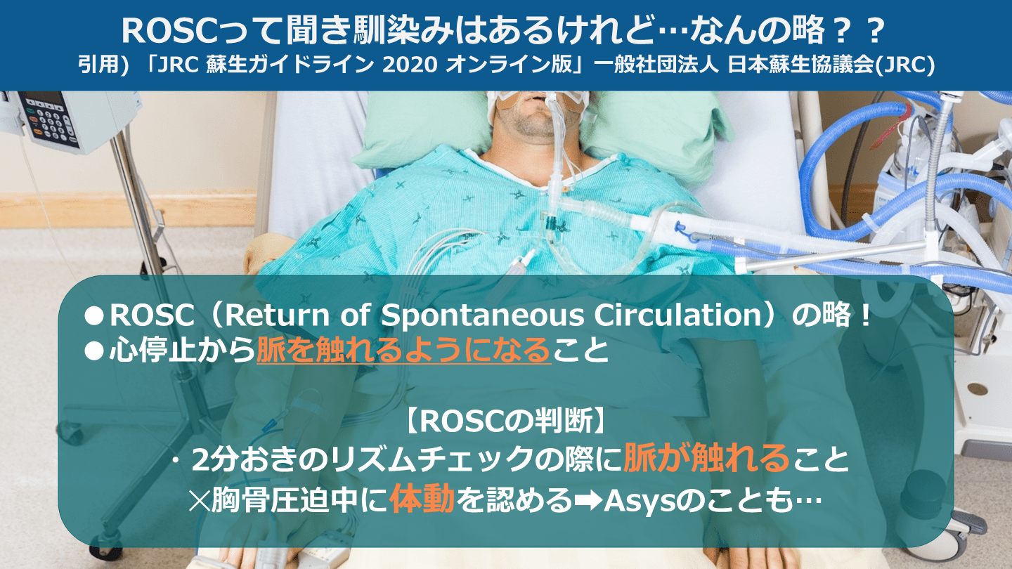 引用) 「JRC 蘇生ガイドライン 2020 オンライン版」一般社団法人 日本蘇生協議会(JRC) ●ROSC(Return of Spontaneous Circulation)の略!
