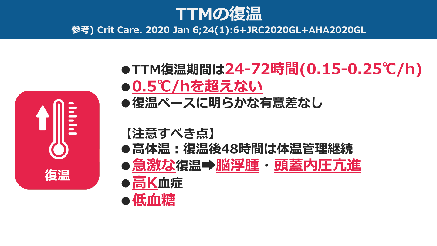参考) Crit Care. 2020 Jan 6;24(1):6+JRC2020GL+AHA2020GL 導入 維持 ●TTM復温期間は24-72時間(0.15-0.25℃/h)
