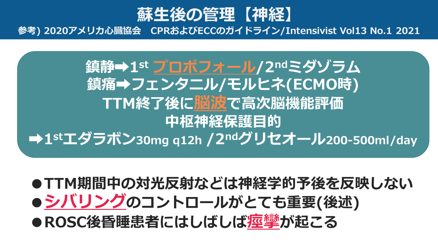 ➡1stエダラボン30mg q12h /2ndグリセオール200-500ml/day ●TTM期間中の対光反射などは神経学的予後を反映しない
