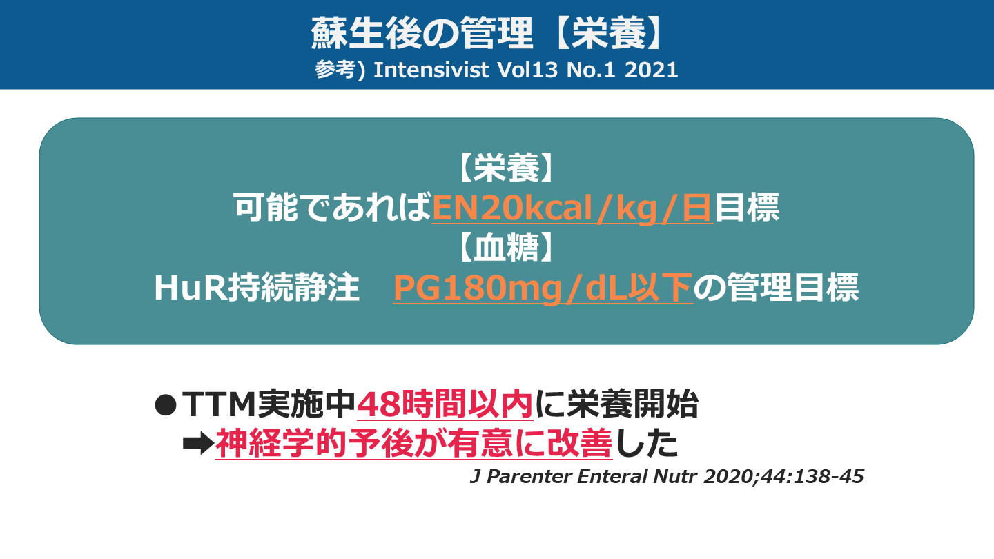 HuR持続静注 PG180mg/dL以下の管理目標 ●TTM実施中48時間以内に栄養開始
