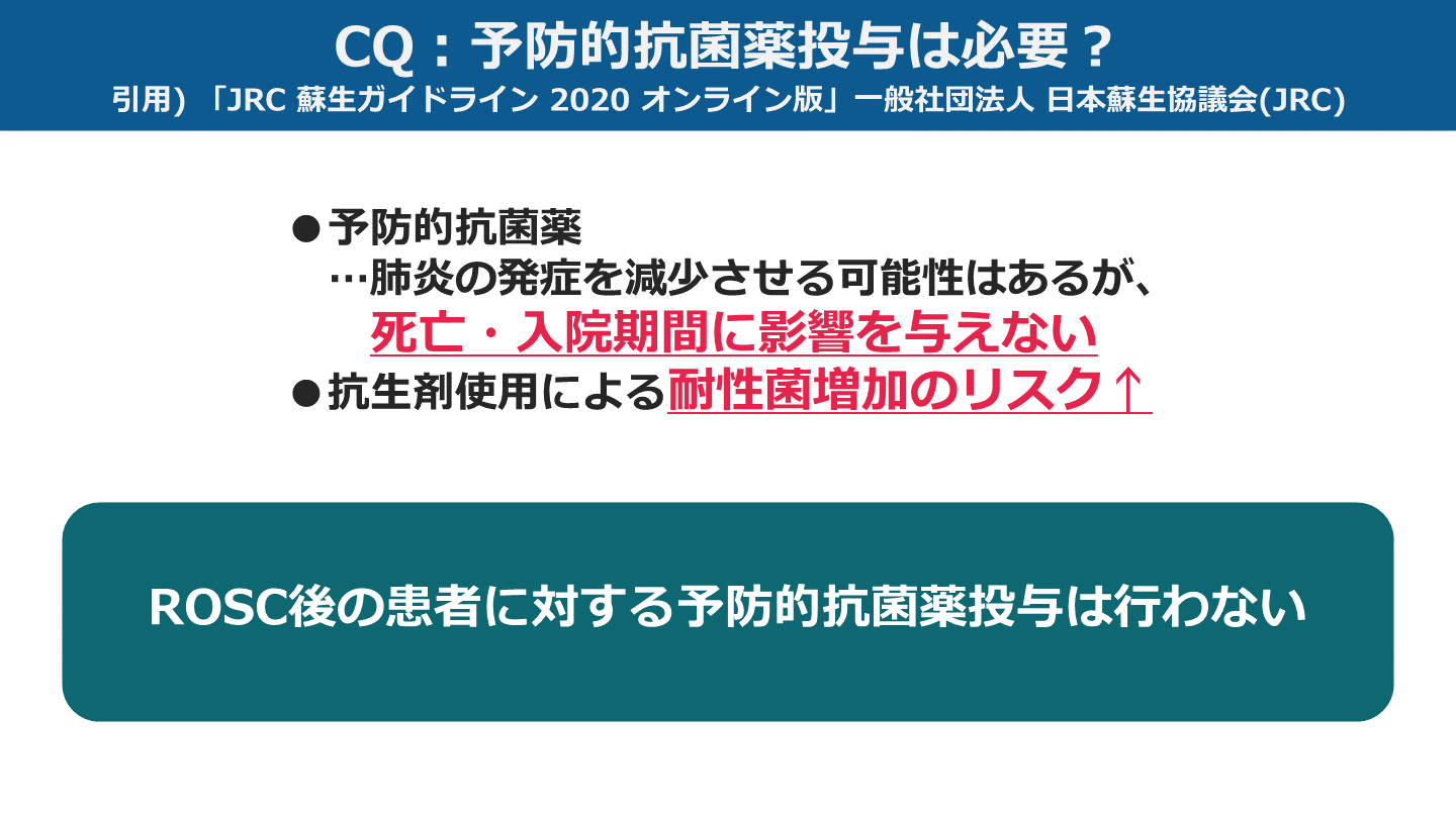 ●抗生剤使用による耐性菌増加のリスク↑ ROSC後の患者に対する予防的抗菌薬投与は行わない