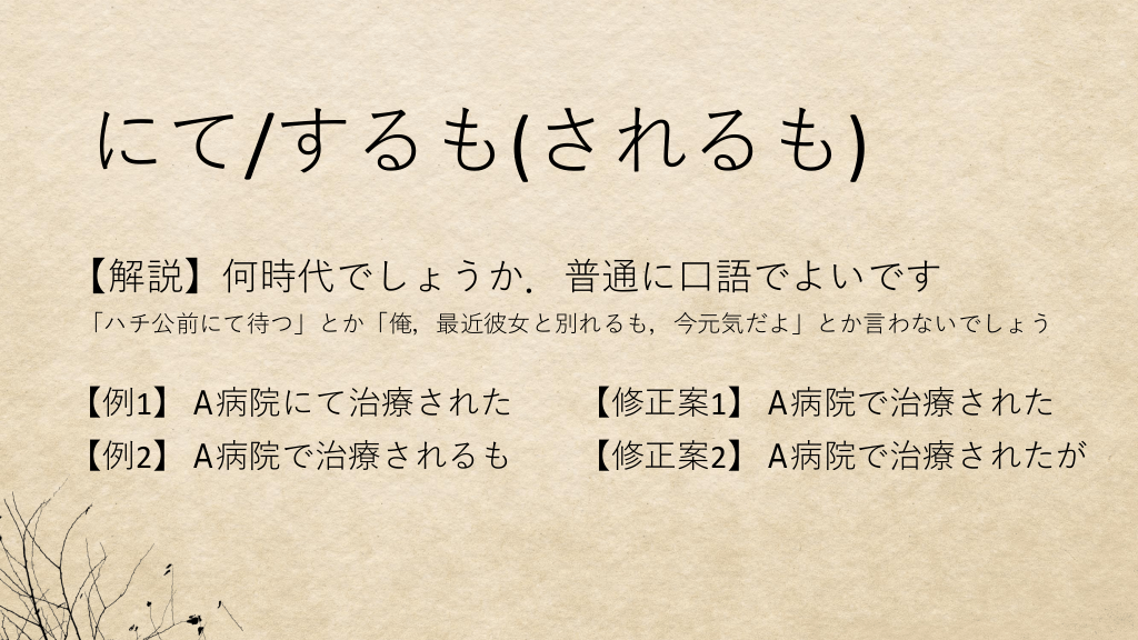 #12. にて/するも(されるも) 【解説】何時代でしょうか.普通に口語でよいです 「ハチ公前にて待つ」とか「俺,最近彼女と別れるも,今元気だよ」とか言わないでしょう 【例1】 A病院にて治療された 【修正案1】 A病院で治療された 【例2】 A病院で治療されるも 【修正案2】 A病院で治療されたが