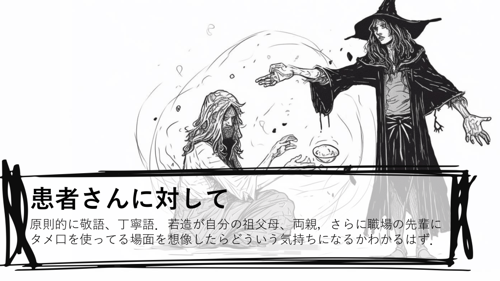 #3. 患者さんに対して 原則的に敬語、丁寧語.若造が自分の祖父母、両親,さらに職場の先輩に タメ口を使ってる場面を想像したらどういう気持ちになるかわかるはず.