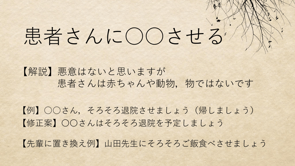 #8. 患者さんに○○させる 【解説】悪意はないと思いますが 患者さんは赤ちゃんや動物,物ではないです 【例】○○さん,そろそろ退院させましょう(帰しましょう) 【修正案】〇〇さんはそろそろ退院を予定しましょう 【先輩に置き換え例】山田先生にそろそろご飯食べさせましょう