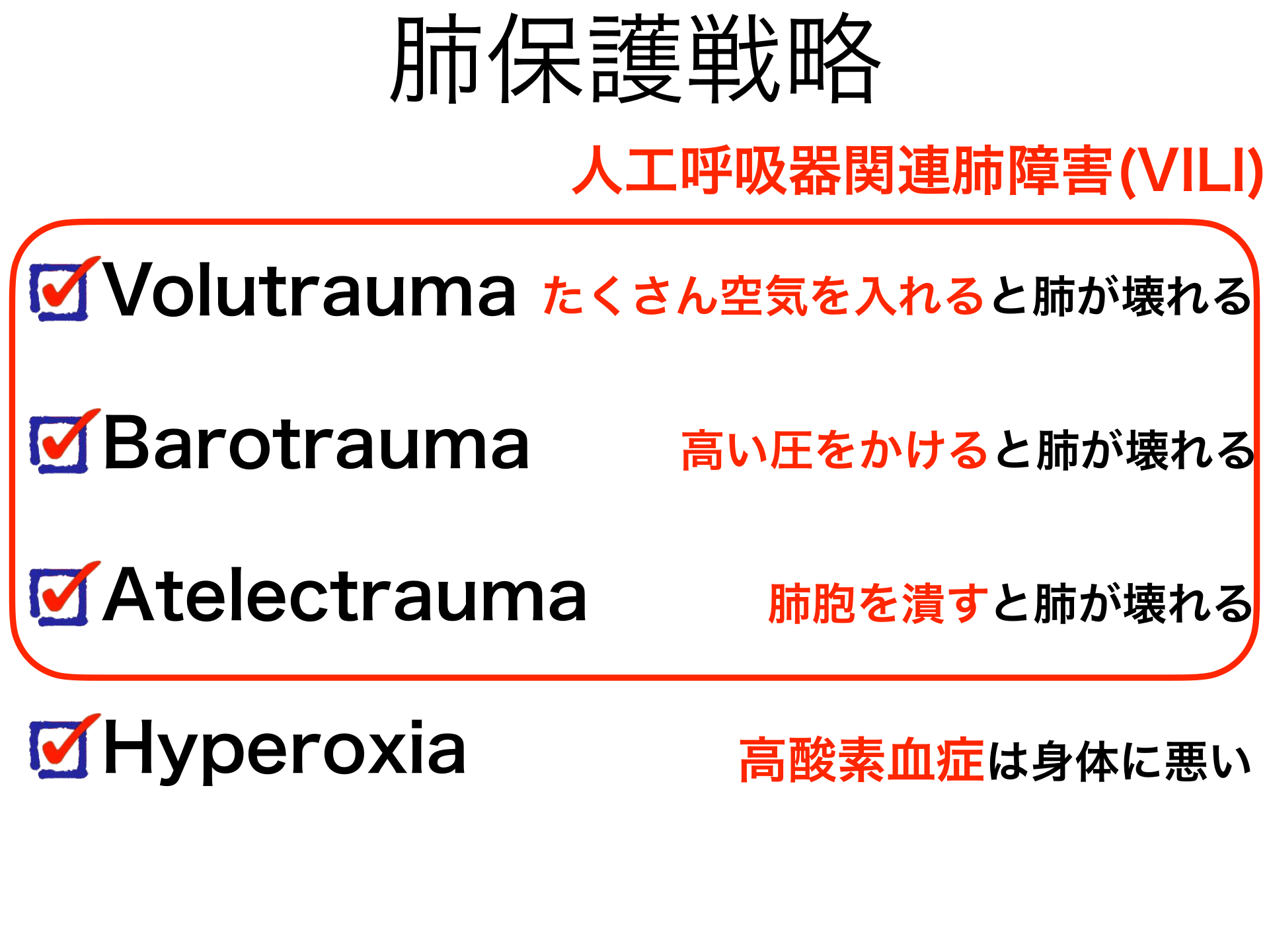 #11. 肺保護戦略 人工呼吸器関連肺障害(VILI) Volutrauma たくさん空気を入れると肺が壊れる Barotrauma Atelectrauma Hyperoxia 高い圧をかけると肺が壊れる 肺胞を潰すと肺が壊れる 高酸素血症は身体に悪い