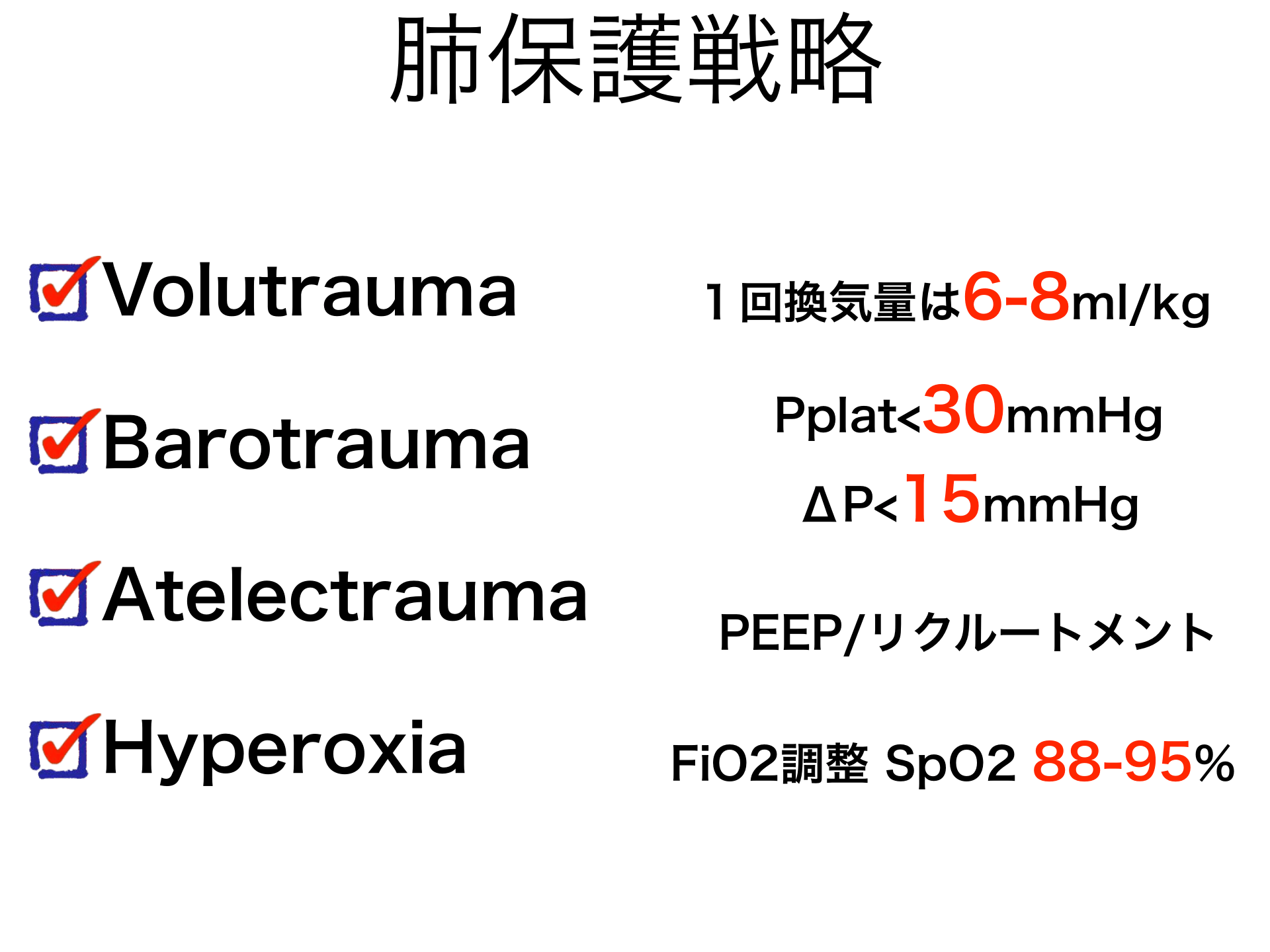 #12. 肺保護戦略 Volutrauma Barotrauma Atelectrauma Hyperoxia 1回換気量は6-8ml/kg Pplat<30mmHg ΔP<15mmHg PEEP/リクルートメント FiO2調整 SpO2 88-95%