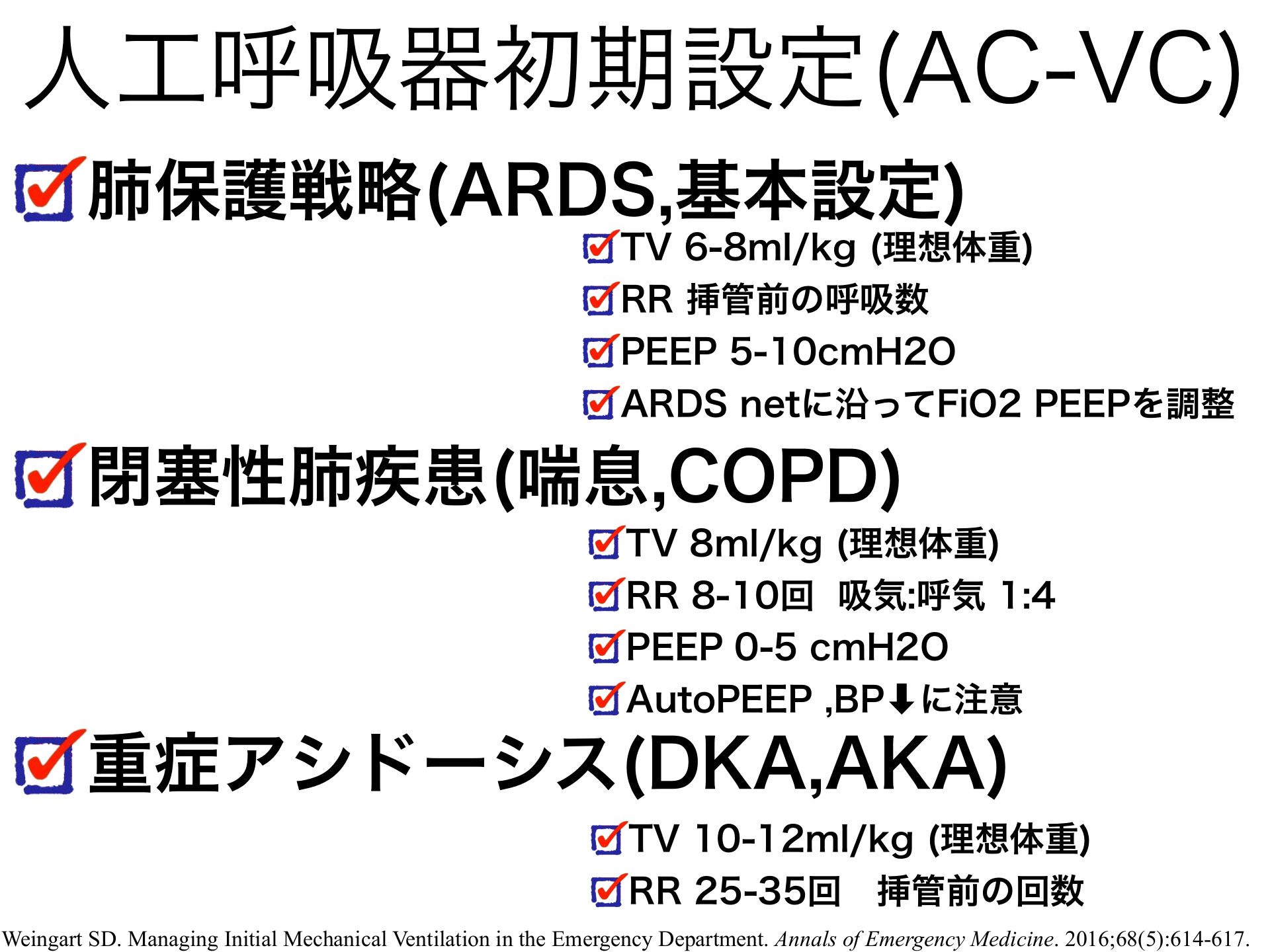 #13. 人工呼吸器初期設定(AC-VC) 肺保護戦略(ARDS,基本設定) TV 6-8ml/kg (理想体重) RR 挿管前の呼吸数 PEEP 5-10cmH2O ARDS netに沿ってFiO2 PEEPを調整 閉塞性肺疾患(喘息,COPD) TV 8ml/kg (理想体重) RR 8-10回 吸気:呼気 1:4 PEEP 0-5 cmH2O AutoPEEP ,BP⬇に注意 重症アシドーシス(DKA,AKA) TV 10-12ml/kg (理想体重) RR 25-35回 挿管前の回数 Weingart SD. Managing Initial Mechanical Ventilation in the Emergency Department. Annals of Emergency Medicine. 2016;68(5):614-617.
