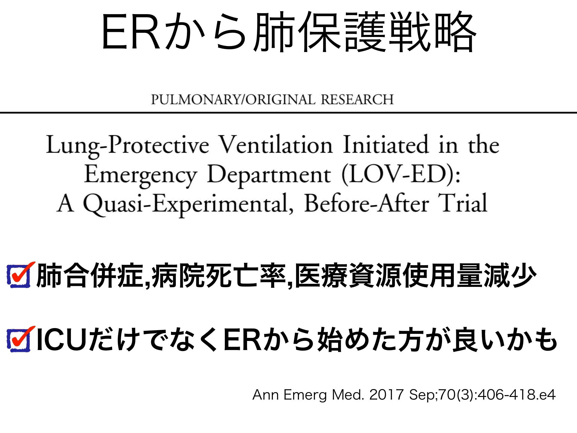 #15. ERから肺保護戦略 肺合併症,病院死亡率,医療資源使用量減少 ICUだけでなくERから始めた方が良いかも Ann Emerg Med. 2017 Sep;70(3):406-418.e4