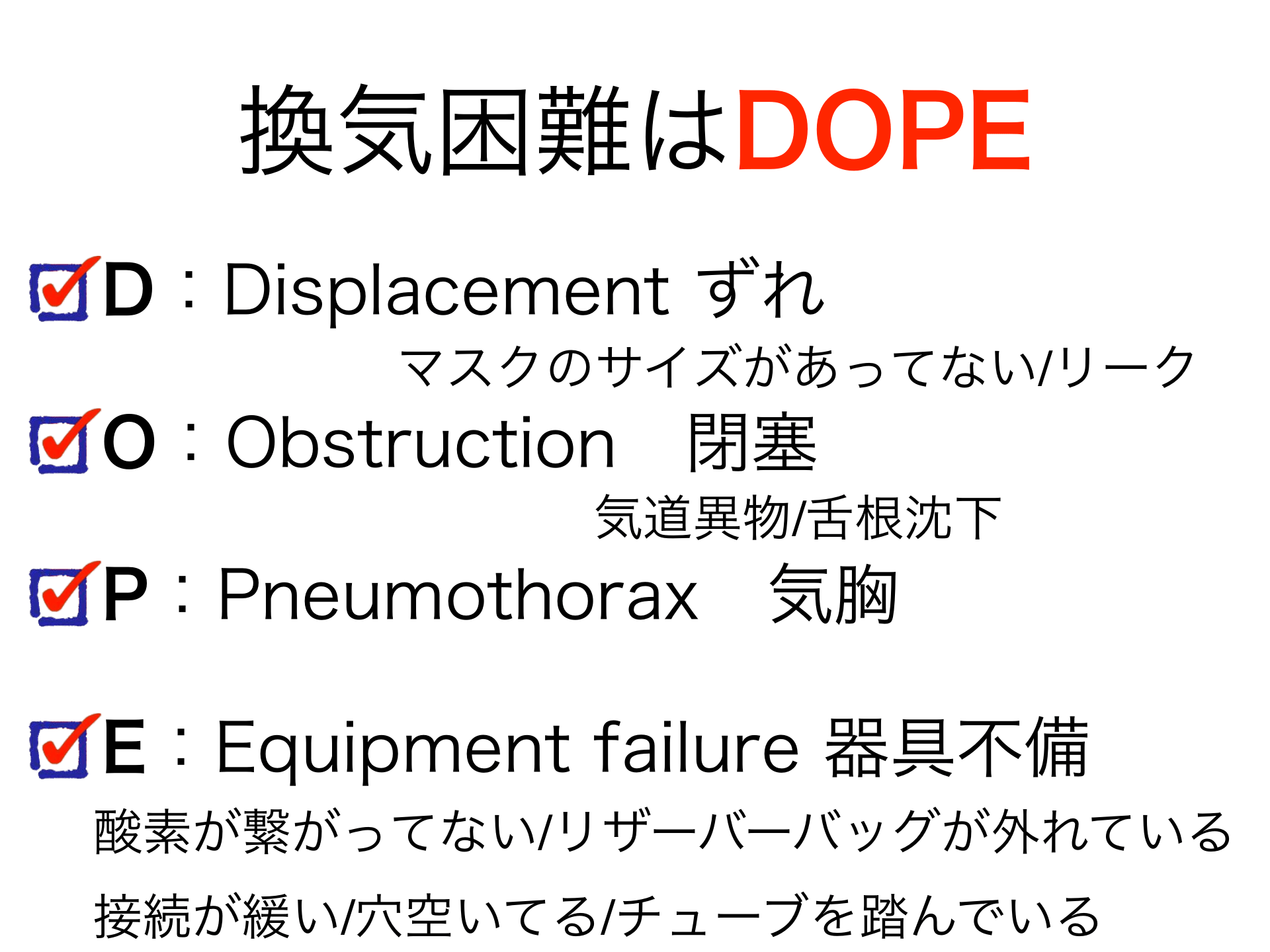 #16. 換気困難はDOPE D:Displacement ずれ マスクのサイズがあってない/リーク O:Obstruction 閉塞 気道異物/舌根沈下 P:Pneumothorax 気胸 E:Equipment failure 器具不備 酸素が繋がってない/リザーバーバッグが外れている 接続が緩い/穴空いてる/チューブを踏んでいる