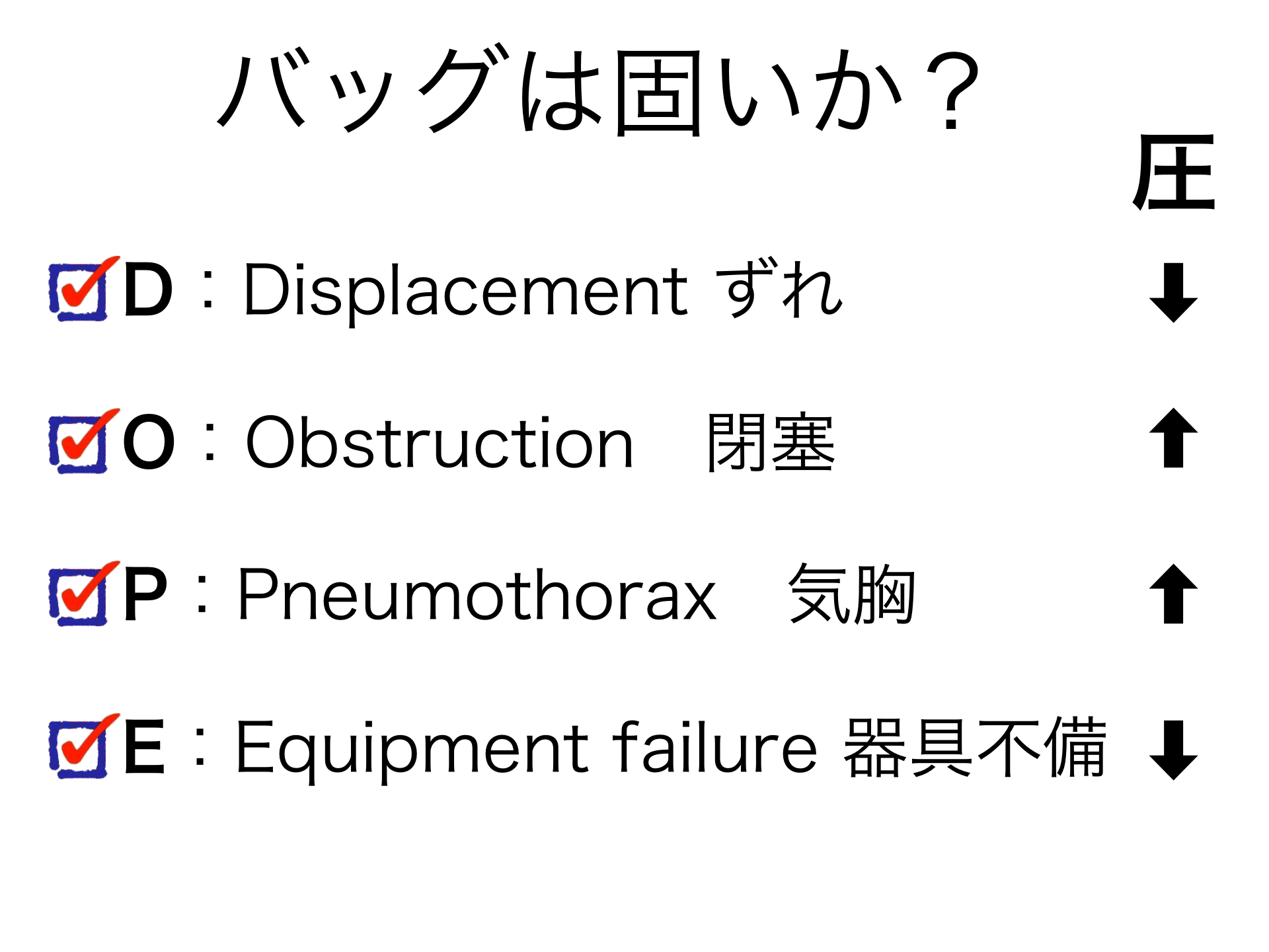 #17. バッグは固いか? D:Displacement ずれ O:Obstruction 閉塞 P:Pneumothorax 気胸 圧 ⬇ ⬆ ⬆ E:Equipment failure 器具不備 ⬇