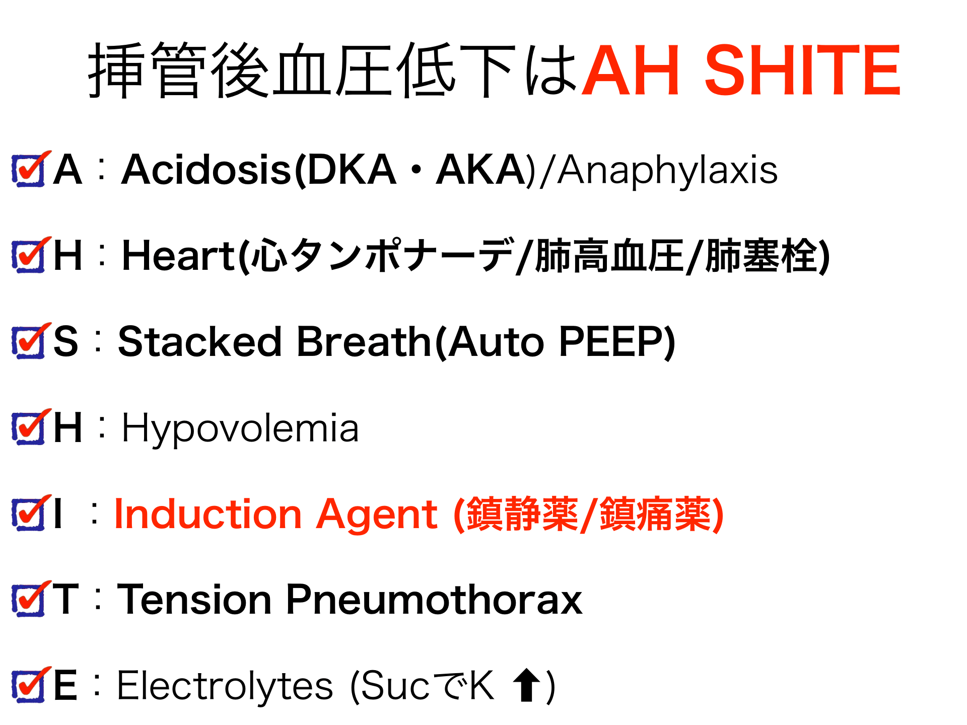 #19. 挿管後血圧低下はAH SHITE A:Acidosis(DKA・AKA)/Anaphylaxis H:Heart(心タンポナーデ/肺高血圧/肺塞栓) S:Stacked Breath(Auto PEEP) H:Hypovolemia I :Induction Agent (鎮静薬/鎮痛薬) T:Tension Pneumothorax E:Electrolytes (SucでK ⬆)