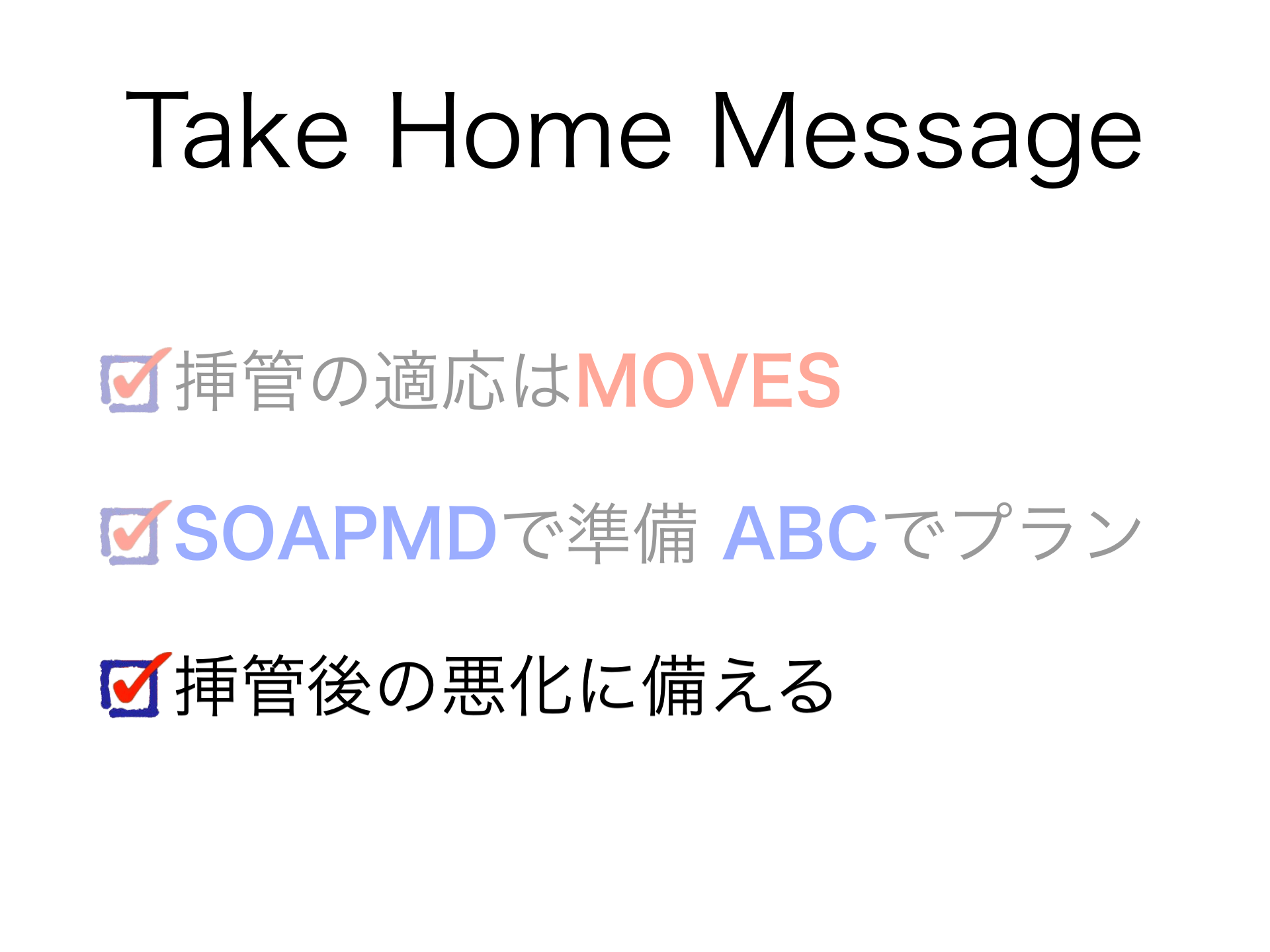 #2. Take Home Message 挿管の適応はMOVES SOAPMDで準備 ABCでプラン 挿管後の悪化に備える