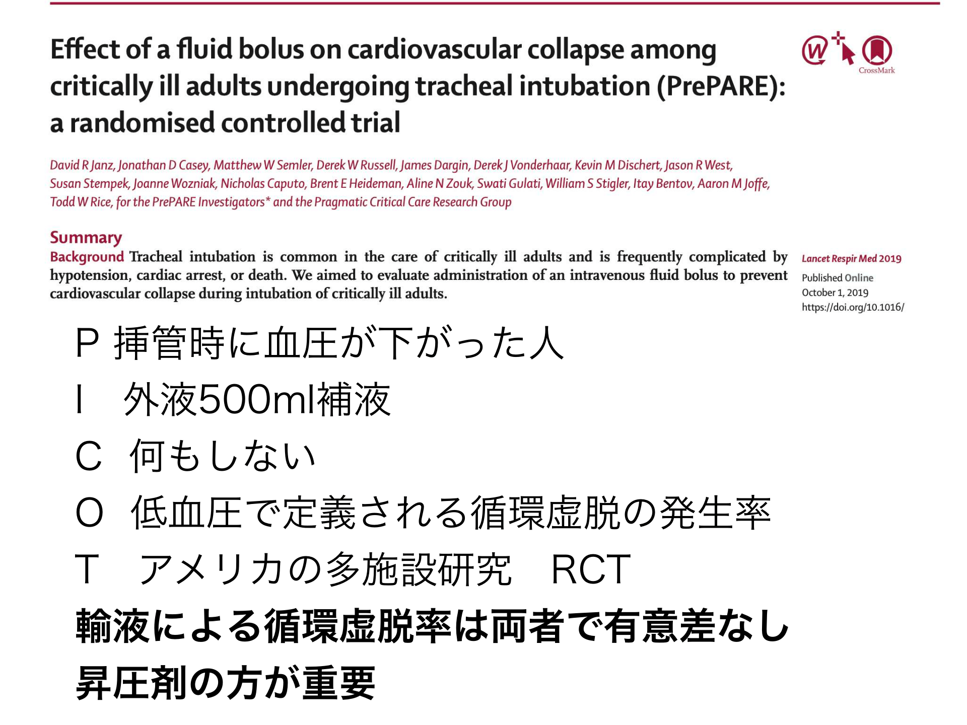 #20. P 挿管時に血圧が下がった人 I 外液500ml補液 C 何もしない O 低血圧で定義される循環虚脱の発生率 T アメリカの多施設研究 RCT 輸液による循環虚脱率は両者で有意差なし 昇圧剤の方が重要