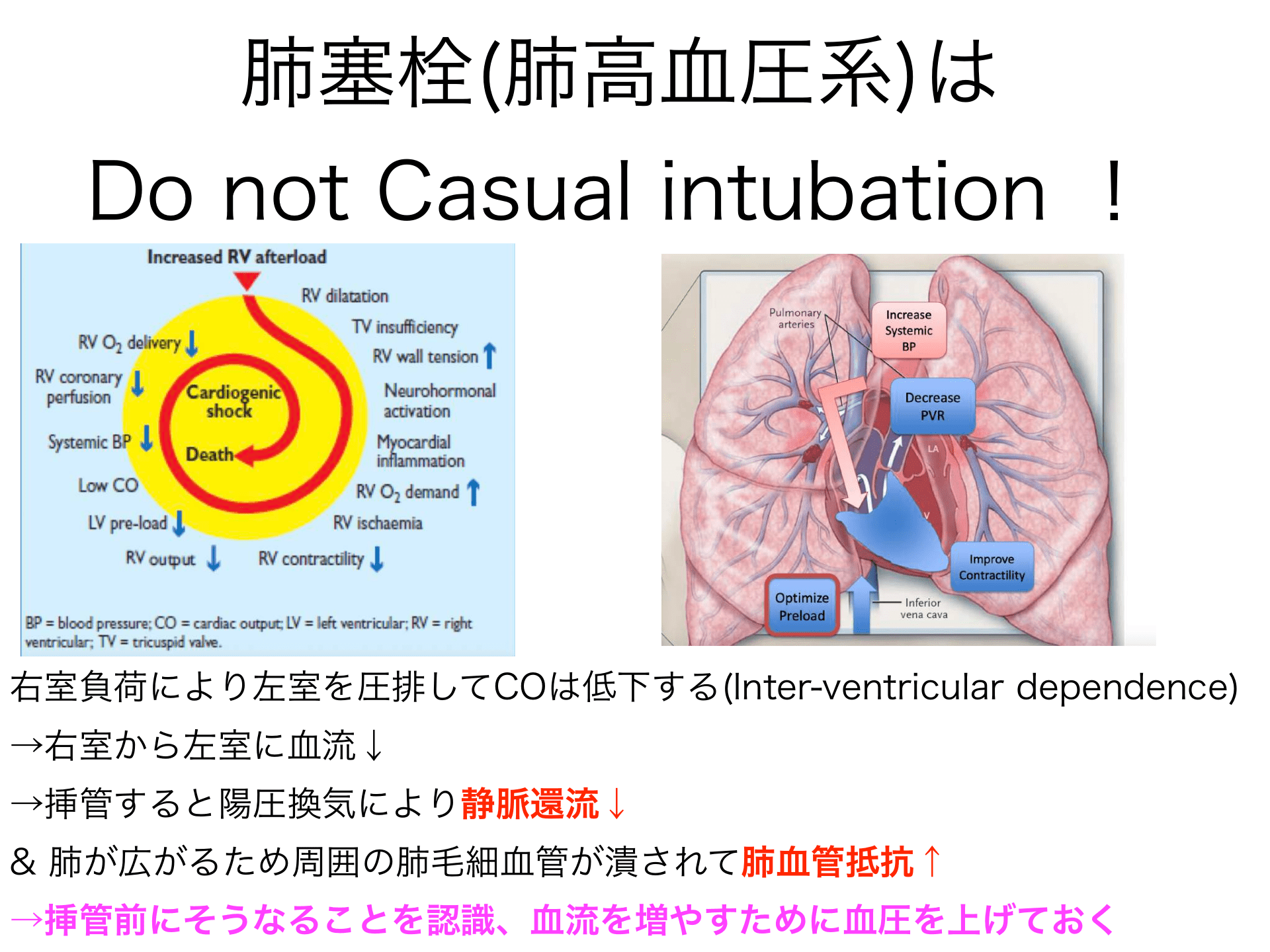 #21. 肺塞栓(肺高血圧系)は Do not Casual intubation ! 右室負荷により左室を圧排してCOは低下する(Inter-ventricular dependence) →右室から左室に血流↓ →挿管すると陽圧換気により静脈還流↓ & 肺が広がるため周囲の肺毛細血管が潰されて肺血管抵抗↑ →挿管前にそうなることを認識、血流を増やすために血圧を上げておく