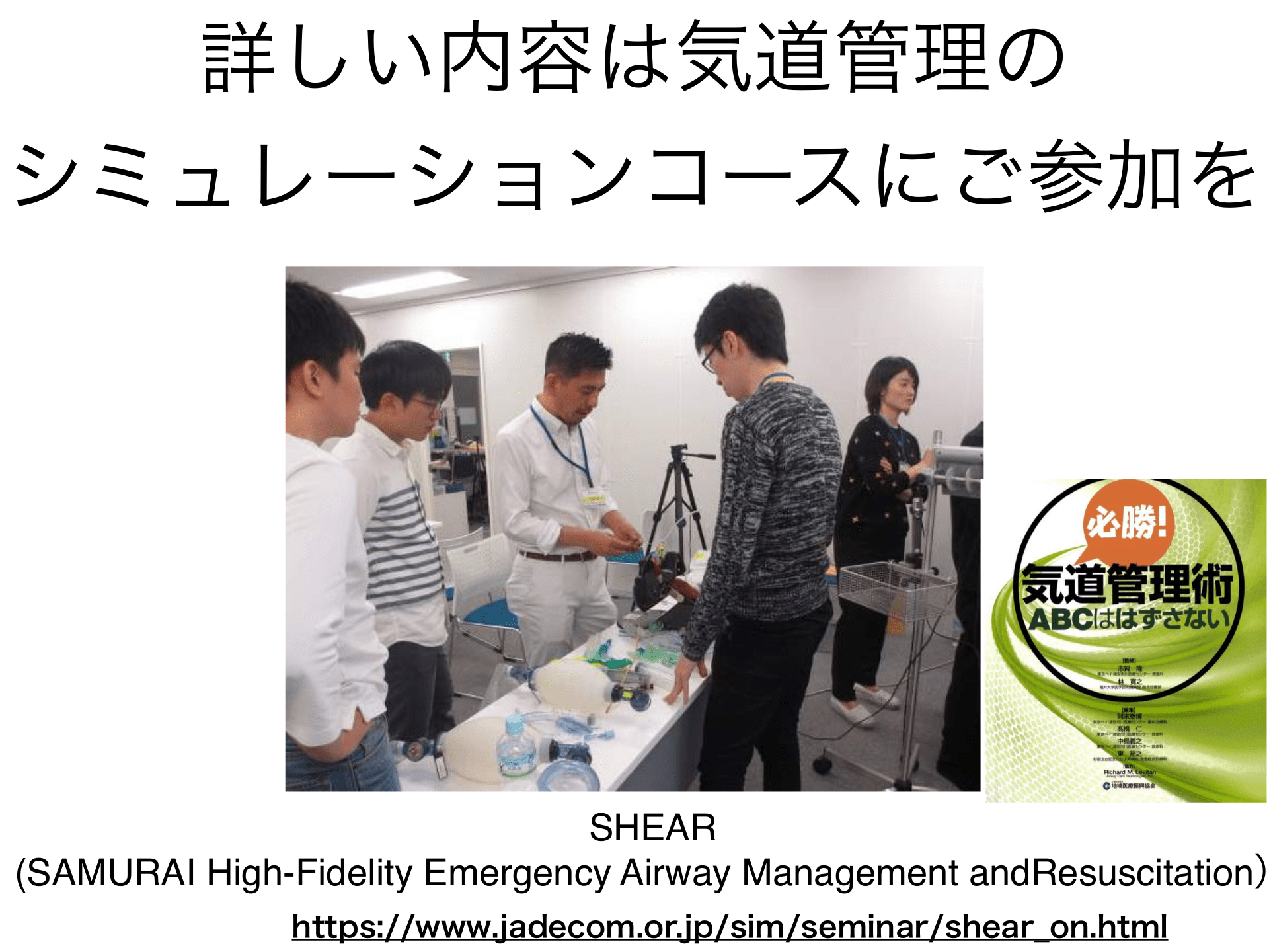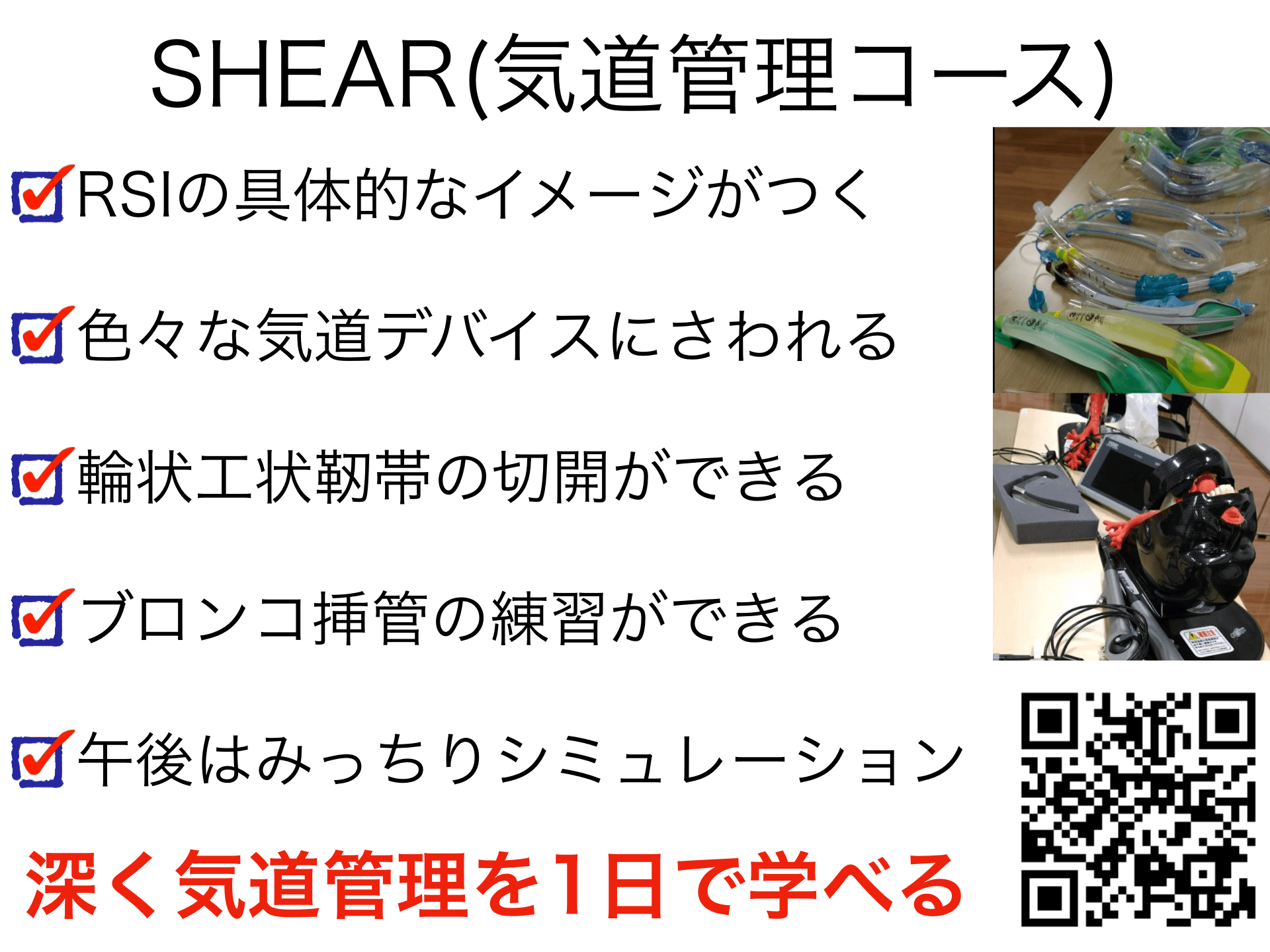 #25. SHEAR(気道管理コース) RSIの具体的なイメージがつく 色々な気道デバイスにさわれる 輪状工状靭帯の切開ができる ブロンコ挿管の練習ができる 午後はみっちりシミュレーション 深く気道管理を1日で学べる
