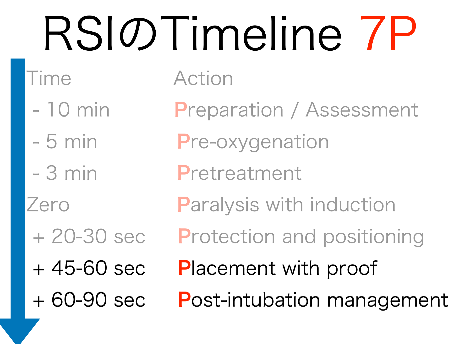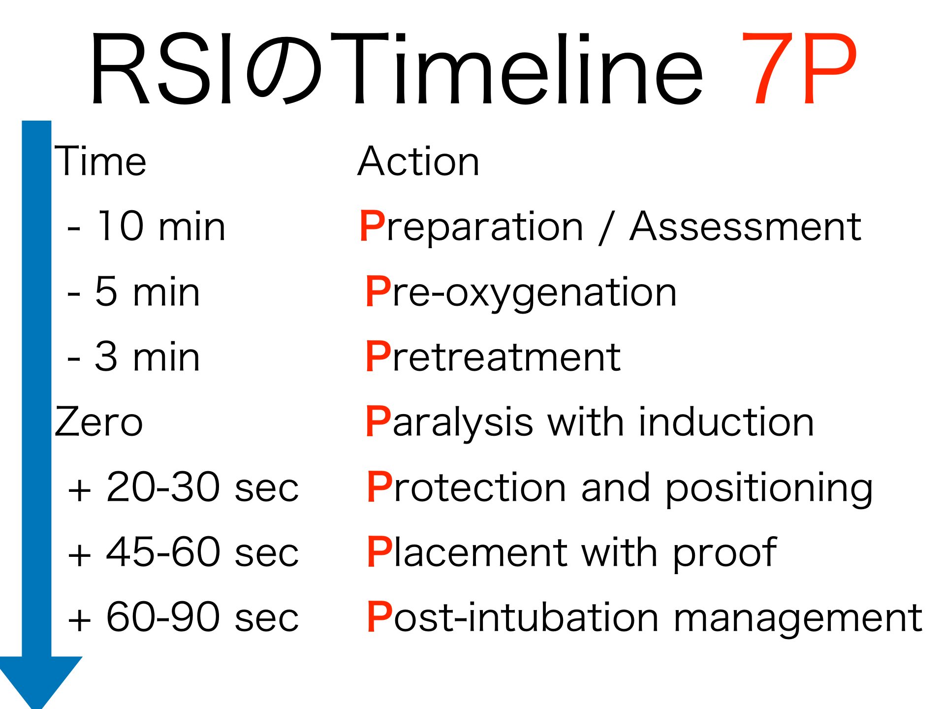 #3. RSIのTimeline 7P Time - 10 min - 5 min - 3 min Zero + 20-30 sec + 45-60 sec + 60-90 sec Action Preparation / Assessment Pre-oxygenation Pretreatment Paralysis with induction Protection and positioning Placement with proof Post-intubation management
