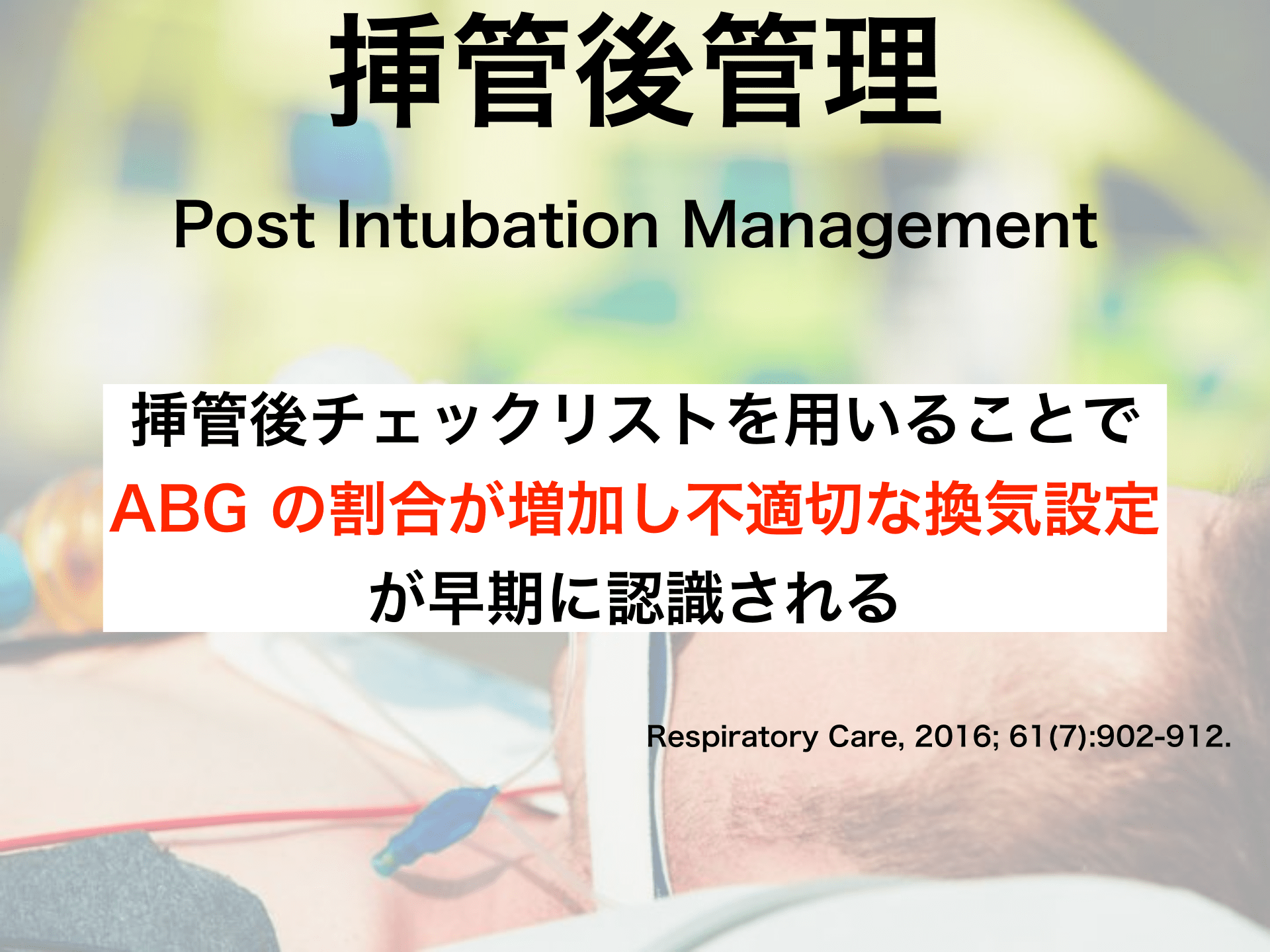 #6. 挿管後管理 Post Intubation Management 挿管後チェックリストを用いることで ABG の割合が増加し不適切な換気設定 が早期に認識される Respiratory Care, 2016; 61(7):902-912.