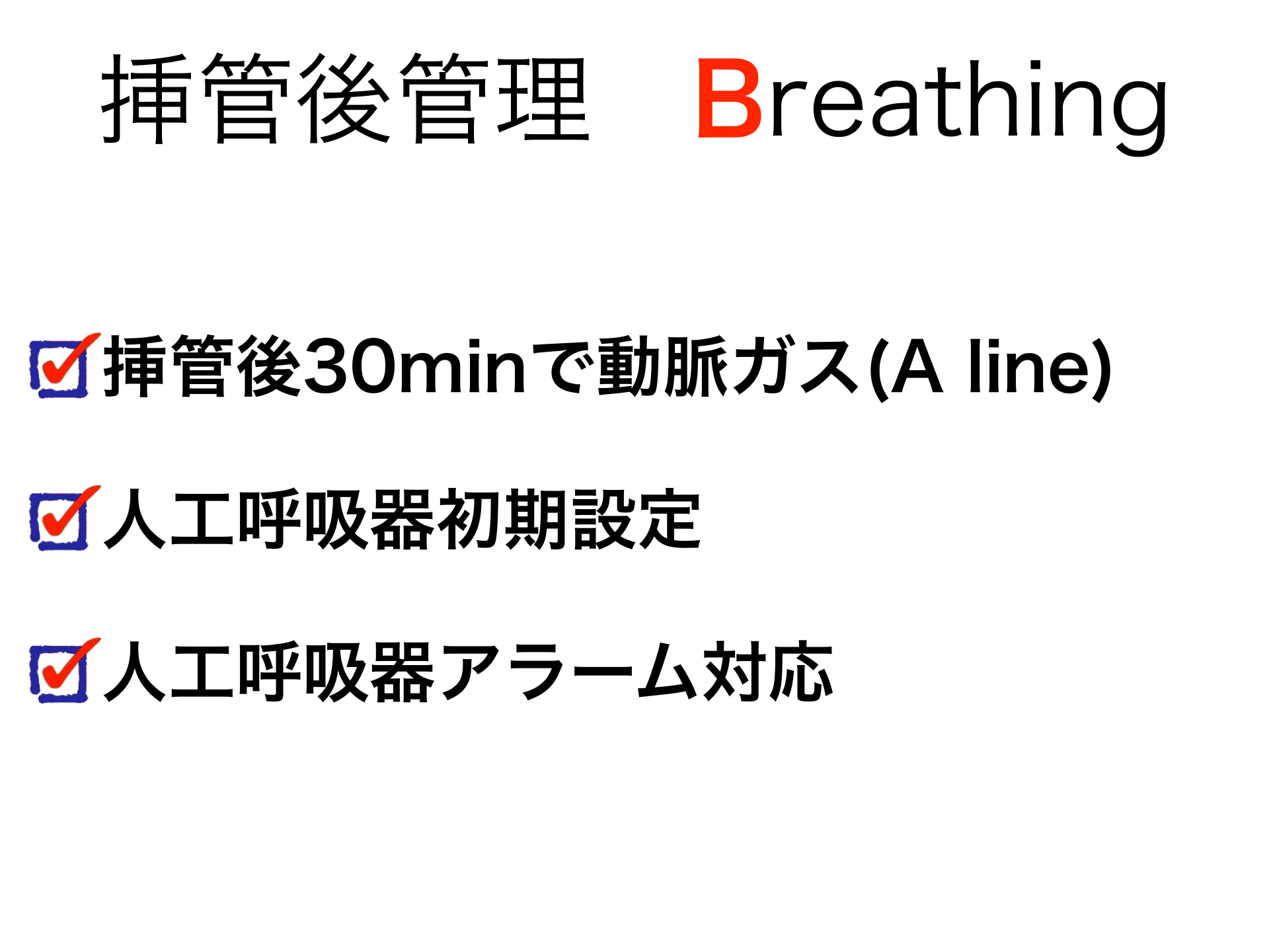 #9. 挿管後管理 Breathing 挿管後30minで動脈ガス(A line) 人工呼吸器初期設定 人工呼吸器アラーム対応
