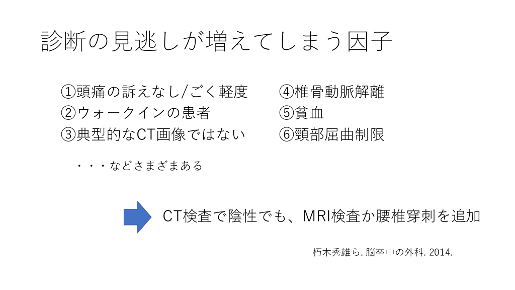 #10. 診断の⾒逃しが増えてしまう因⼦ ①頭痛の訴えなし/ごく軽度 ②ウォークインの患者 ③典型的なCT画像ではない ④椎⾻動脈解離 ⑤貧⾎ ⑥頸部屈曲制限 ・・・などさまざまある CT検査で陰性でも、MRI検査か腰椎穿刺を追加 朽⽊秀雄ら. 脳卒中の外科. 2014.