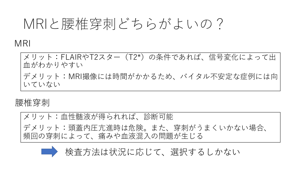 #11. MRIと腰椎穿刺どちらがよいの? MRI メリット:FLAIRやT2スター(T2*)の条件であれば、信号変化によって出 ⾎がわかりやすい デメリット:MRI撮像には時間がかかるため、バイタル不安定な症例には向 いていない 腰椎穿刺 メリット:⾎性髄液が得られれば、診断可能 デメリット:頭蓋内圧亢進時は危険。また、穿刺がうまくいかない場合、 頻回の穿刺によって、痛みや⾎液混⼊の問題が⽣じる 検査⽅法は状況に応じて、選択するしかない