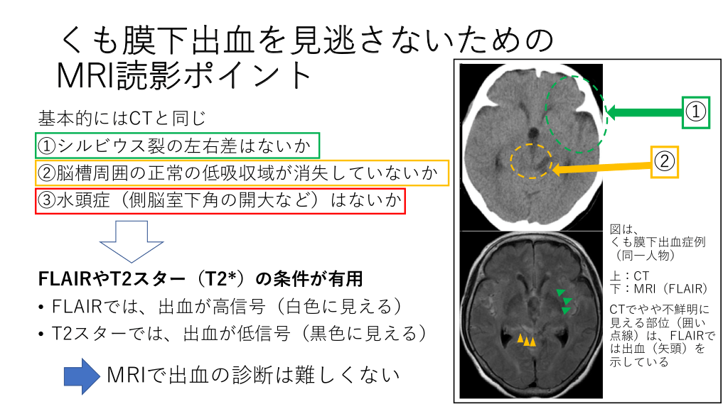 #12. くも膜下出⾎を⾒逃さないための MRI読影ポイント 基本的にはCTと同じ ①シルビウス裂の左右差はないか ②脳槽周囲の正常の低吸収域が消失していないか ③⽔頭症(側脳室下⾓の開⼤など)はないか ① ② 図は、 くも膜下出⾎症例 (同⼀⼈物) FLAIRやT2スター(T2*)の条件が有⽤ • FLAIRでは、出⾎が⾼信号(⽩⾊に⾒える) • T2スターでは、出⾎が低信号(⿊⾊に⾒える) MRIで出⾎の診断は難しくない 上:CT 下:MRI(FLAIR) CTでやや不鮮明に ⾒える部位(囲い 点線)は、FLAIRで は出⾎(⽮頭)を ⽰している