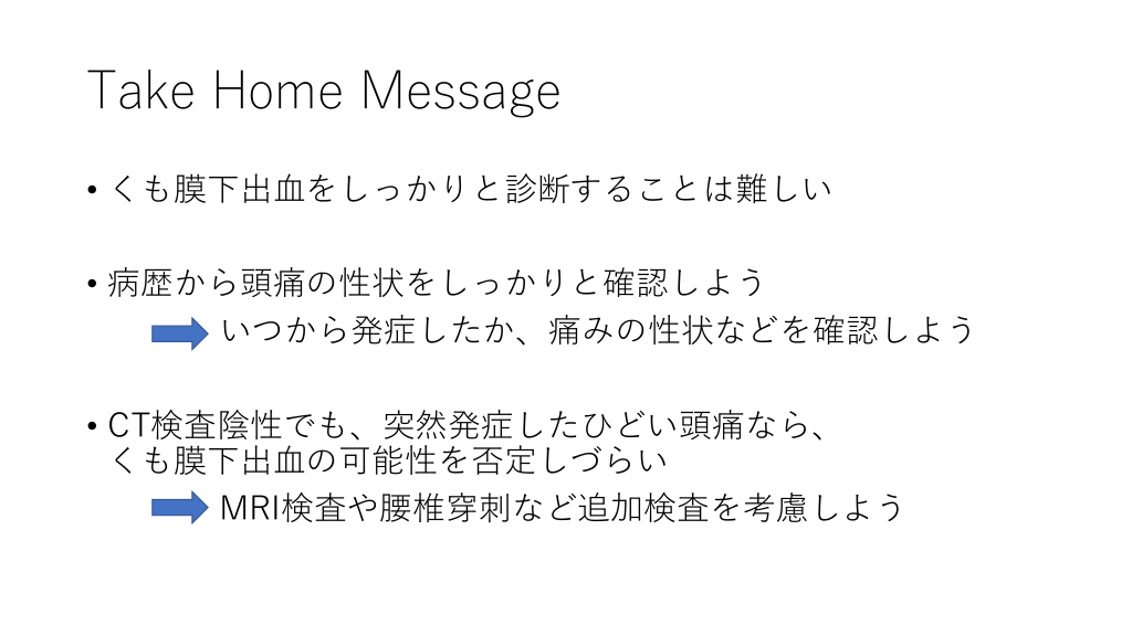 #13. Take Home Message • くも膜下出⾎をしっかりと診断することは難しい • 病歴から頭痛の性状をしっかりと確認しよう いつから発症したか、痛みの性状などを確認しよう • CT検査陰性でも、突然発症したひどい頭痛なら、 くも膜下出⾎の可能性を否定しづらい MRI検査や腰椎穿刺など追加検査を考慮しよう