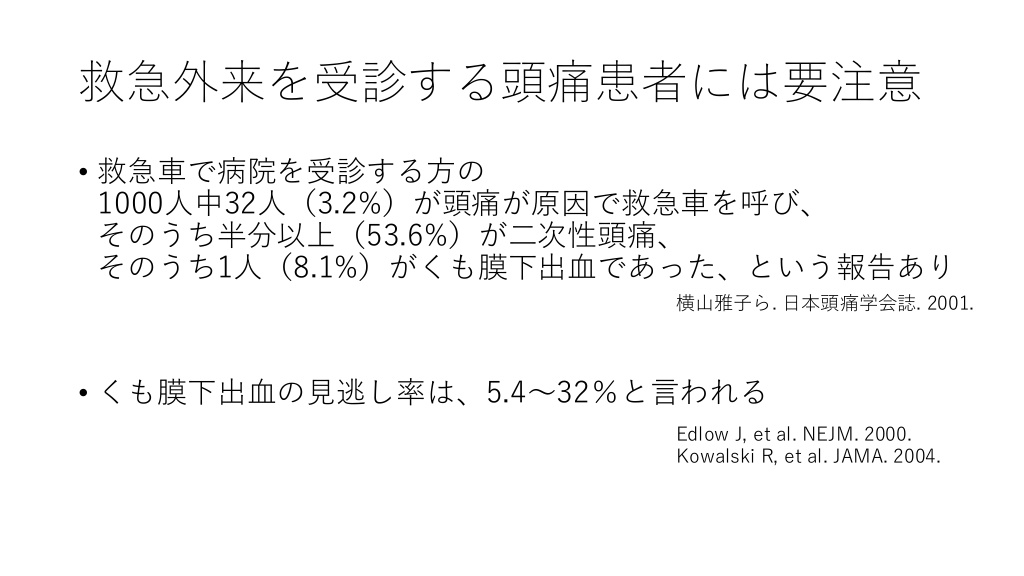 #4. 救急外来を受診する頭痛患者には要注意 • 救急⾞で病院を受診する⽅の 1000⼈中32⼈(3.2%)が頭痛が原因で救急⾞を呼び、 そのうち半分以上(53.6%)が⼆次性頭痛、 そのうち1⼈(8.1%)がくも膜下出⾎であった、という報告あり 横⼭雅⼦ら. ⽇本頭痛学会誌. 2001. • くも膜下出⾎の⾒逃し率は、5.4〜32%と⾔われる Edlow J, et al. NEJM. 2000. Kowalski R, et al. JAMA. 2004.