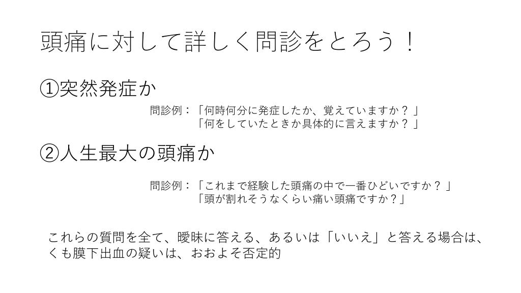 #5. 頭痛に対して詳しく問診をとろう! ①突然発症か 問診例:「何時何分に発症したか、覚えていますか? 」 「何をしていたときか具体的に⾔えますか? 」 ②⼈⽣最⼤の頭痛か 問診例:「これまで経験した頭痛の中で⼀番ひどいですか? 」 「頭が割れそうなくらい痛い頭痛ですか?」 これらの質問を全て、曖昧に答える、あるいは「いいえ」と答える場合は、 くも膜下出⾎の疑いは、おおよそ否定的