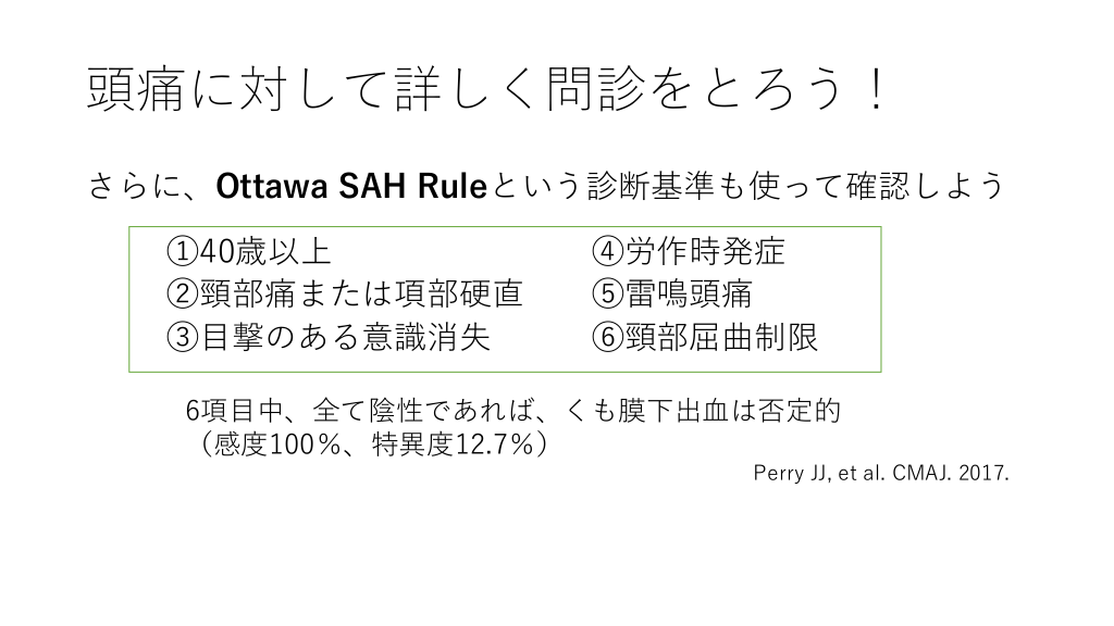 #6. 頭痛に対して詳しく問診をとろう! さらに、Ottawa SAH Ruleという診断基準も使って確認しよう ①40歳以上 ②頸部痛または項部硬直 ③⽬撃のある意識消失 ④労作時発症 ⑤雷鳴頭痛 ⑥頸部屈曲制限 6項⽬中、全て陰性であれば、くも膜下出⾎は否定的 (感度100%、特異度12.7%) Perry JJ, et al. CMAJ. 2017.