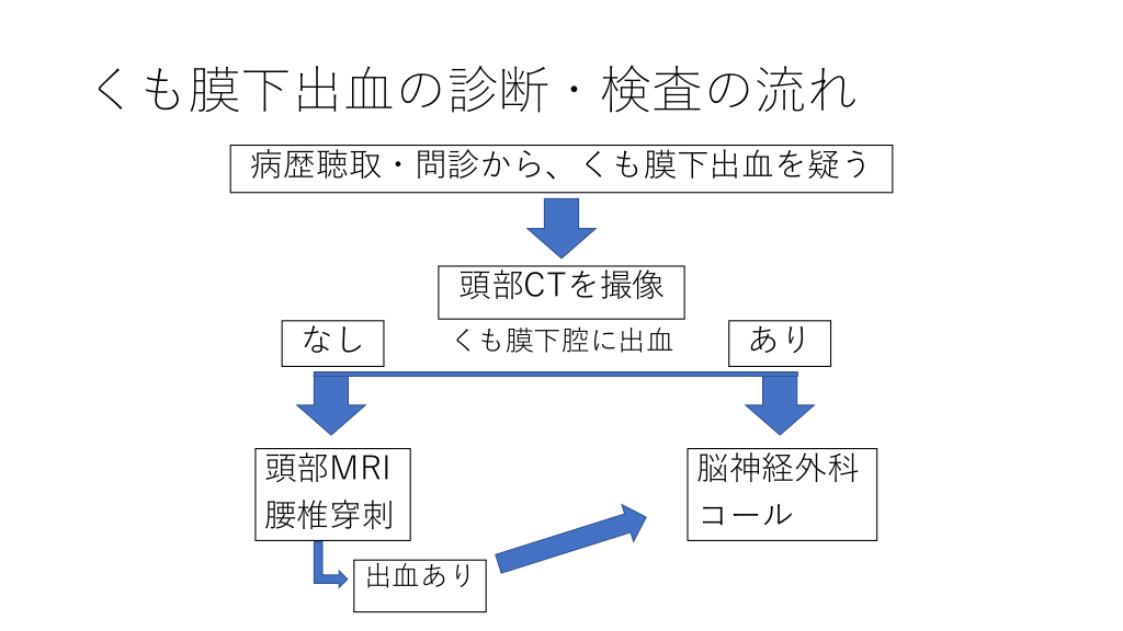 #7. くも膜下出⾎の診断・検査の流れ 病歴聴取・問診から、くも膜下出⾎を疑う 頭部CTを撮像 なし くも膜下腔に出⾎ 頭部MRI 腰椎穿刺 出⾎あり あり 脳神経外科 コール