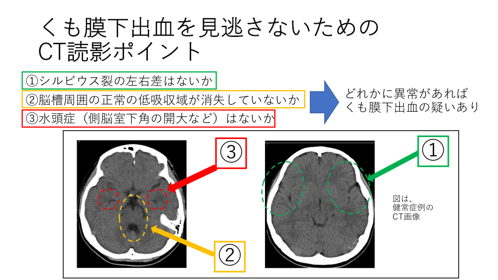 #8. くも膜下出⾎を⾒逃さないための CT読影ポイント ①シルビウス裂の左右差はないか ②脳槽周囲の正常の低吸収域が消失していないか ③⽔頭症(側脳室下⾓の開⼤など)はないか ③ どれかに異常があれば くも膜下出⾎の疑いあり ① 図は、 健常症例の CT画像 ②