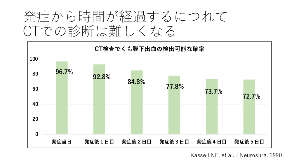 #9. 発症から時間が経過するにつれて CTでの診断は難しくなる CT検査でくも膜下出⾎の検出可能な確率 100 80 96.7% 92.8% 84.8% 60 77.8% 73.7% 72.7% 40 20 0 発症当⽇ 発症後1⽇⽬ 発症後2⽇⽬ 発症後3⽇⽬ 発症後4⽇⽬ 発症後5⽇⽬ Kassell NF, et al. J Neurosurg. 1990