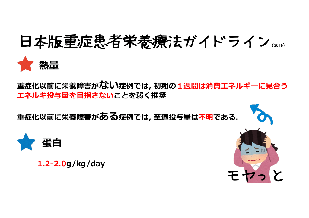 #10. 日本版重症患者栄養療法ガイドライン (2016) 熱量 重症化以前に栄養障害がない症例では, 初期の1週間は消費エネルギーに⾒合う エネルギ投与量を⽬指さないことを弱く推奨 重症化以前に栄養障害がある症例では, ⾄適投与量は不明である. 蛋⽩ 1.2-2.0g/kg/day モヤっと