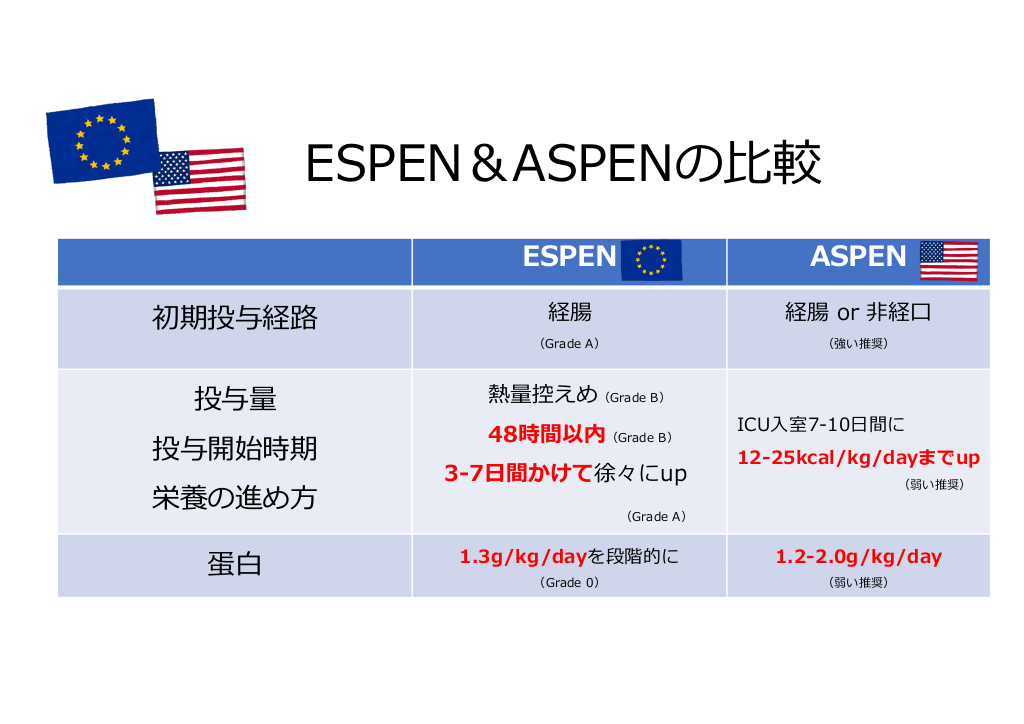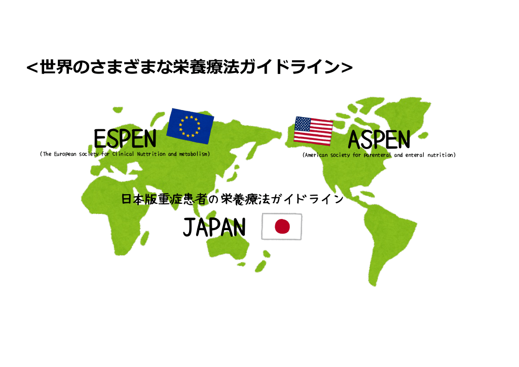 #9. <世界のさまざまな栄養療法ガイドライン> ESPEN ASPEN (The European society for Clinical Nuttrition and metabolism) (American society for parenteral and enteral nutrition) 日本版重症患者の栄養療法ガイドライン JAPAN