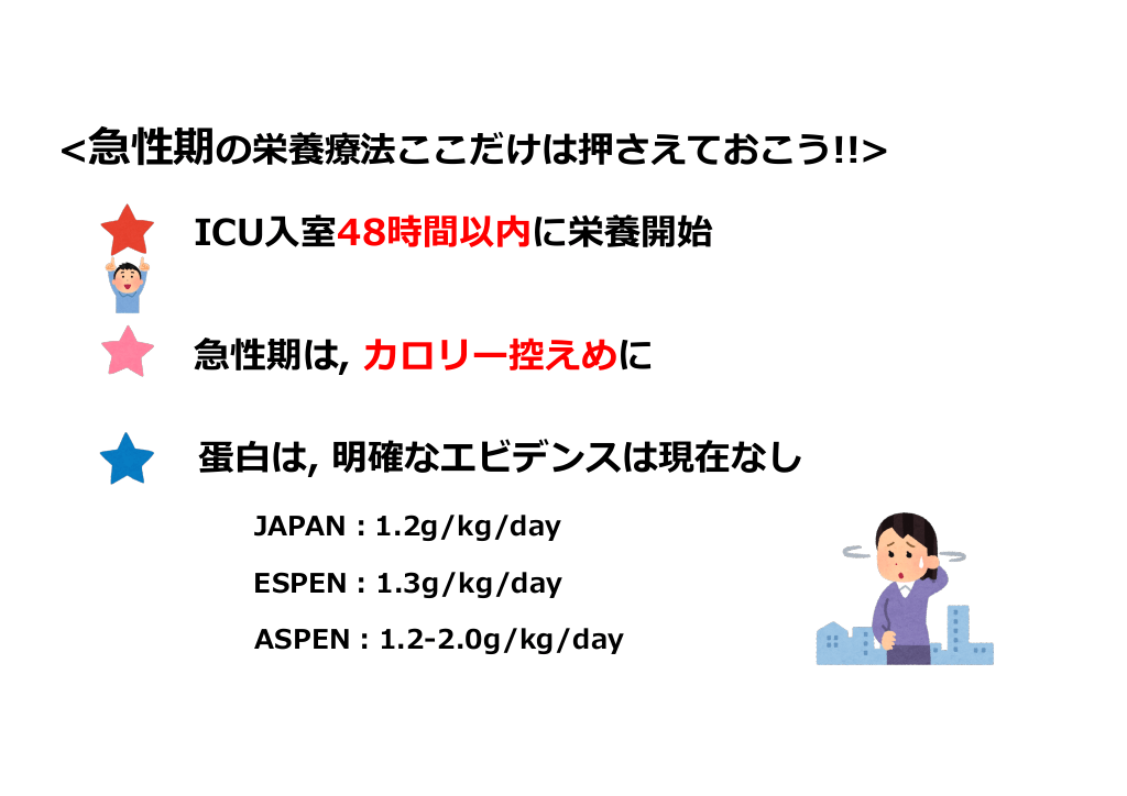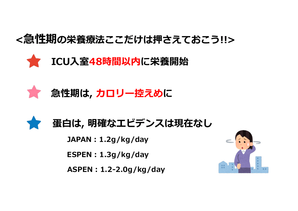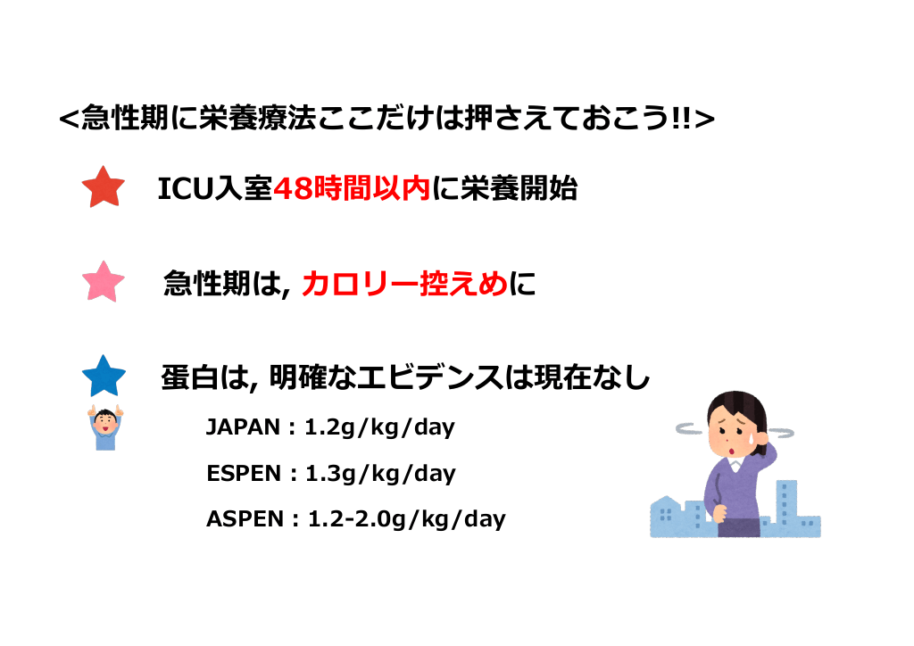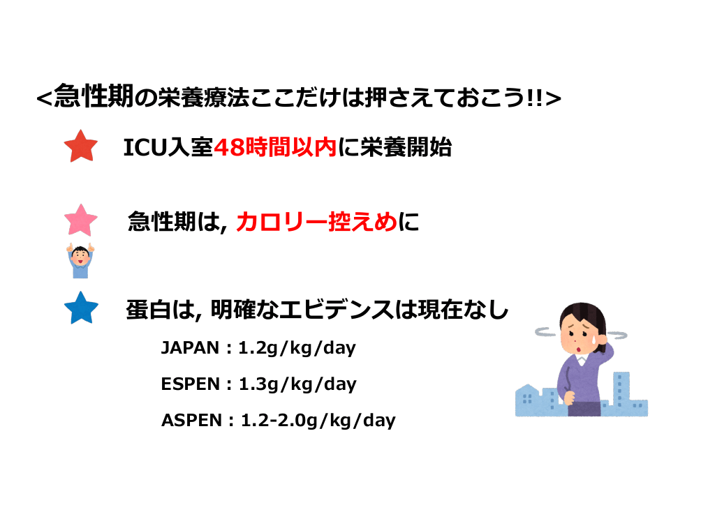 #21. <急性期に栄養療法ここだけは押さえておこう!!> ICU⼊室48時間以内に栄養開始 急性期は, カロリー控えめに 蛋⽩は, 明確なエビデンスは現在なし JAPAN︓1.2g/kg/day ESPEN︓1.3g/kg/day ASPEN︓1.2-2.0g/kg/day