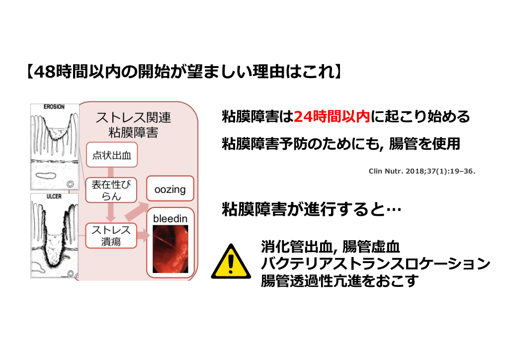 #14. 【48時間以内の開始が望ましい理由はこれ】 ⼈⼯呼吸器管理中はPPIを全症例使⽤ 粘膜障害は24時間以内に起こり始める 粘膜障害予防のためにも, 腸管を使⽤ Clin Nutr. 2018;37(1):19–36. 粘膜障害が進⾏すると… 消化管出⾎, 腸管虚⾎ バクテリアストランスロケーション 腸管透過性亢進をおこす