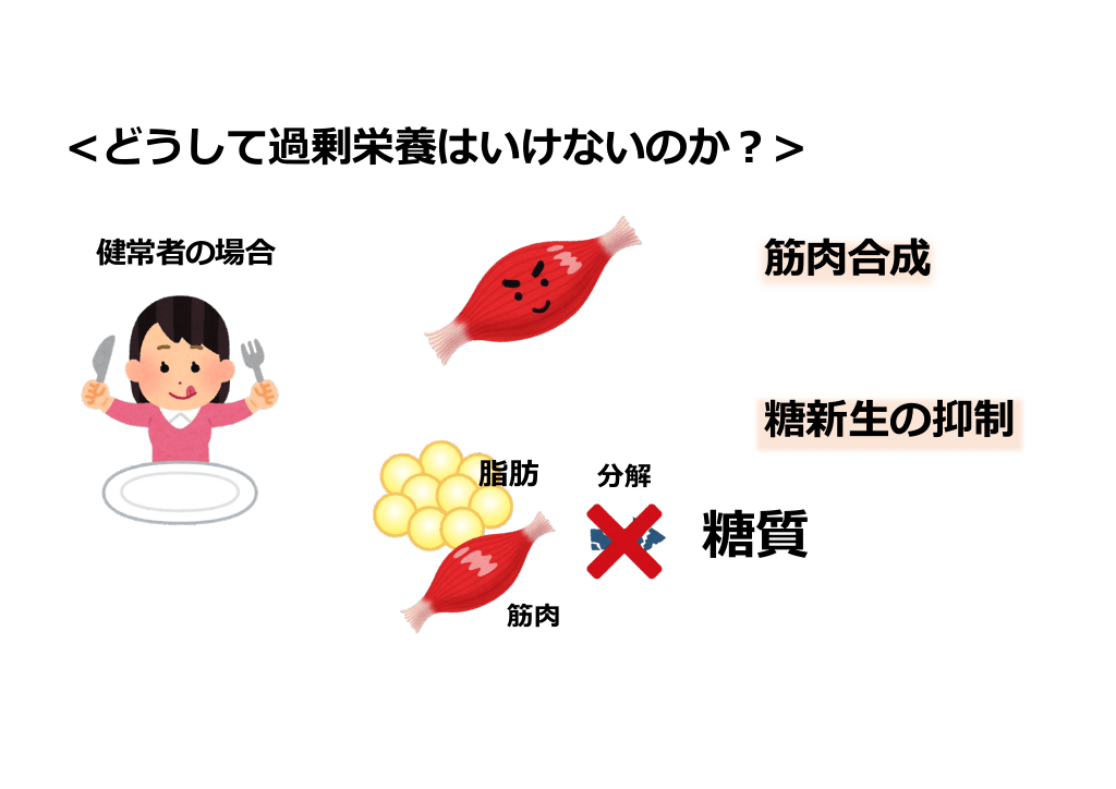 #16. <どうして過剰栄養はいけないのか︖> 筋⾁合成 健常者の場合 脂肪 筋⾁ 糖新⽣の抑制 分解 糖質