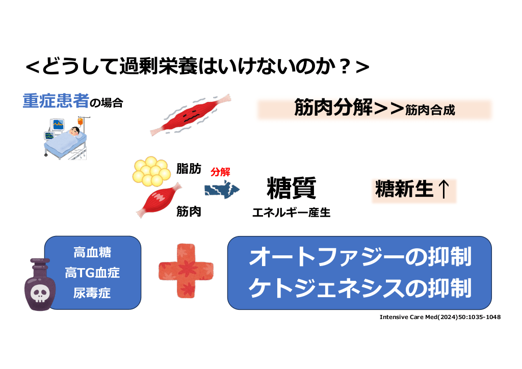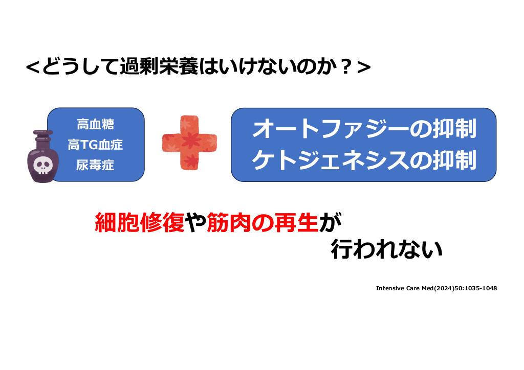 #20. <どうして過剰栄養はいけないのか︖> ⾼⾎糖 ⾼TG⾎症 尿毒症 オートファジーの抑制 ケトジェネシスの抑制 細胞修復や筋⾁の再⽣が ⾏われない Intensive Care Med(2024)50:1035-1048
