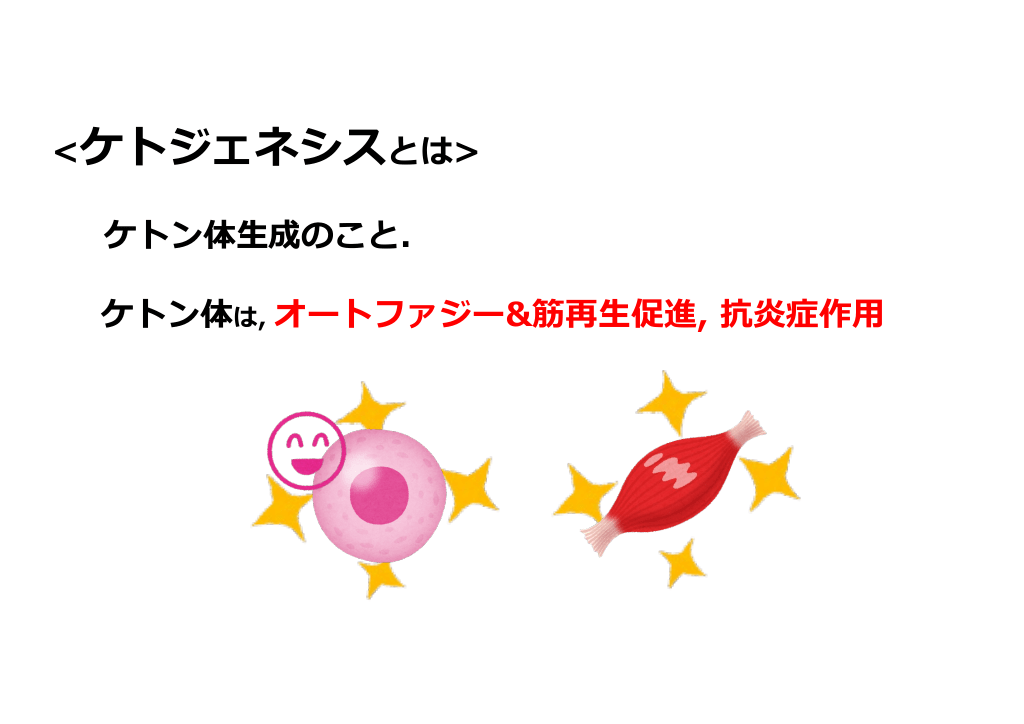 #19. <ケトジェネシスとは> ケトン体⽣成のこと. ケトン体は, オートファジー&筋再⽣促進, 抗炎症作⽤