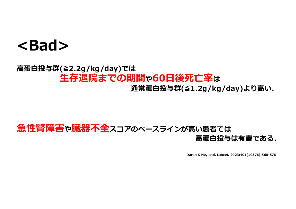 #22. <Bad> ⾼蛋⽩投与群(≧2.2g/kg/day)では ⽣存退院までの期間や60⽇後死亡率は 通常蛋⽩投与群(≦1.2g/kg/day)より⾼い. 急性腎障害や臓器不全スコアのベースラインが⾼い患者では ⾼蛋⽩投与は有害である. Daren K Heyland. Lancet. 2023;401(10376):568-576