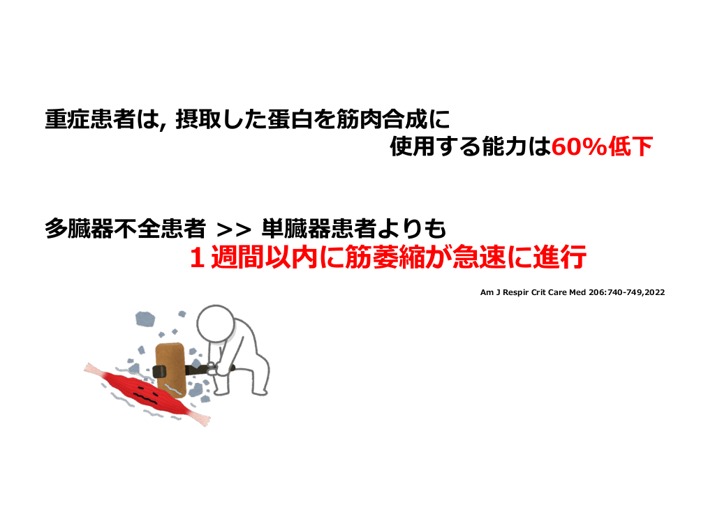 #23. 重症患者は, 摂取した蛋⽩を筋⾁合成に 使⽤する能⼒は60%低下 多臓器不全患者 >> 単臓器患者よりも 1週間以内に筋萎縮が急速に進⾏ Am J Respir Crit Care Med 206:740-749,2022