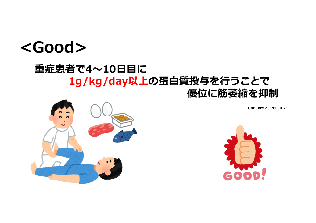 #24. <Good> 重症患者で4〜10⽇⽬に 1g/kg/day以上の蛋⽩質投与を⾏うことで 優位に筋萎縮を抑制 Crit Care 25:260,2021