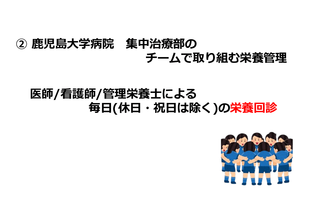 #25. ② ⿅児島⼤学病院 集中治療部の チームで取り組む栄養管理 医師/看護師/管理栄養⼠による 毎⽇(休⽇・祝⽇は除く)の栄養回診